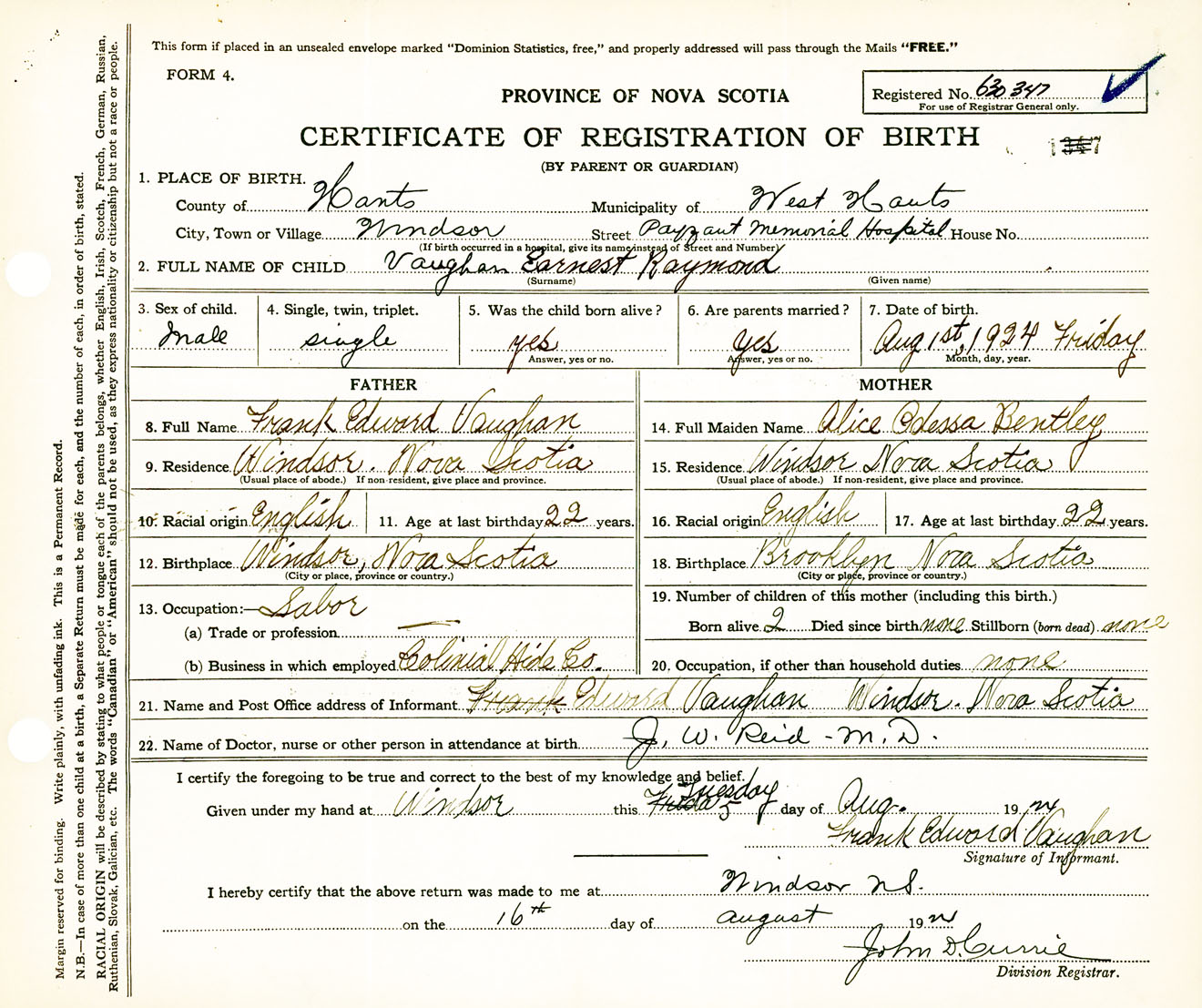 Male Birth Registration: Year: 1924 number: 63000347