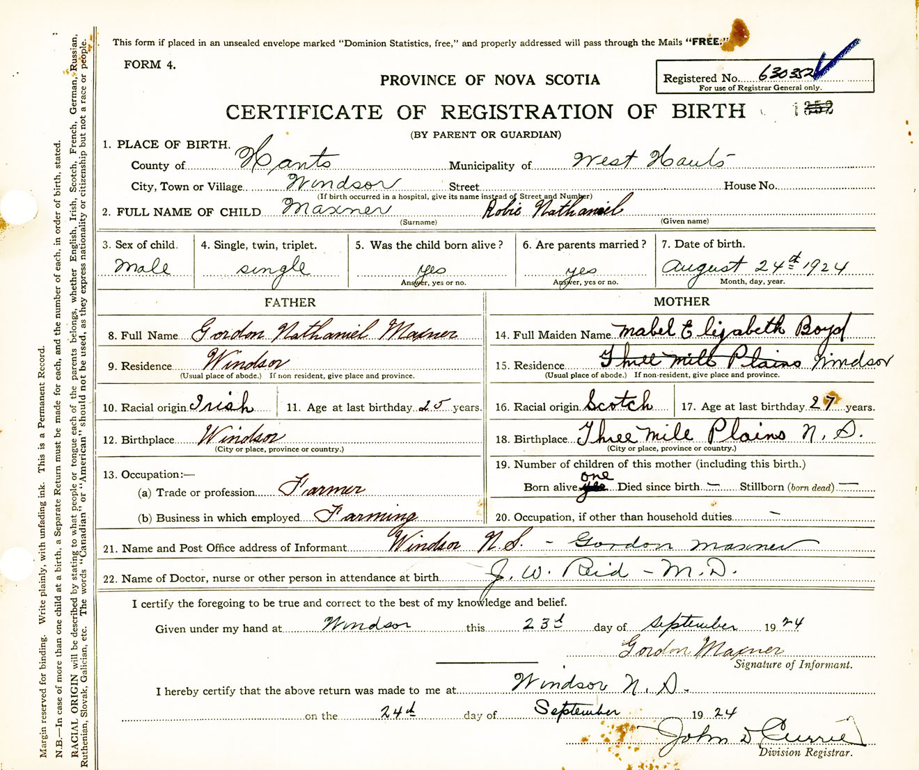 Male Birth Registration: Year: 1924 number: 63000352