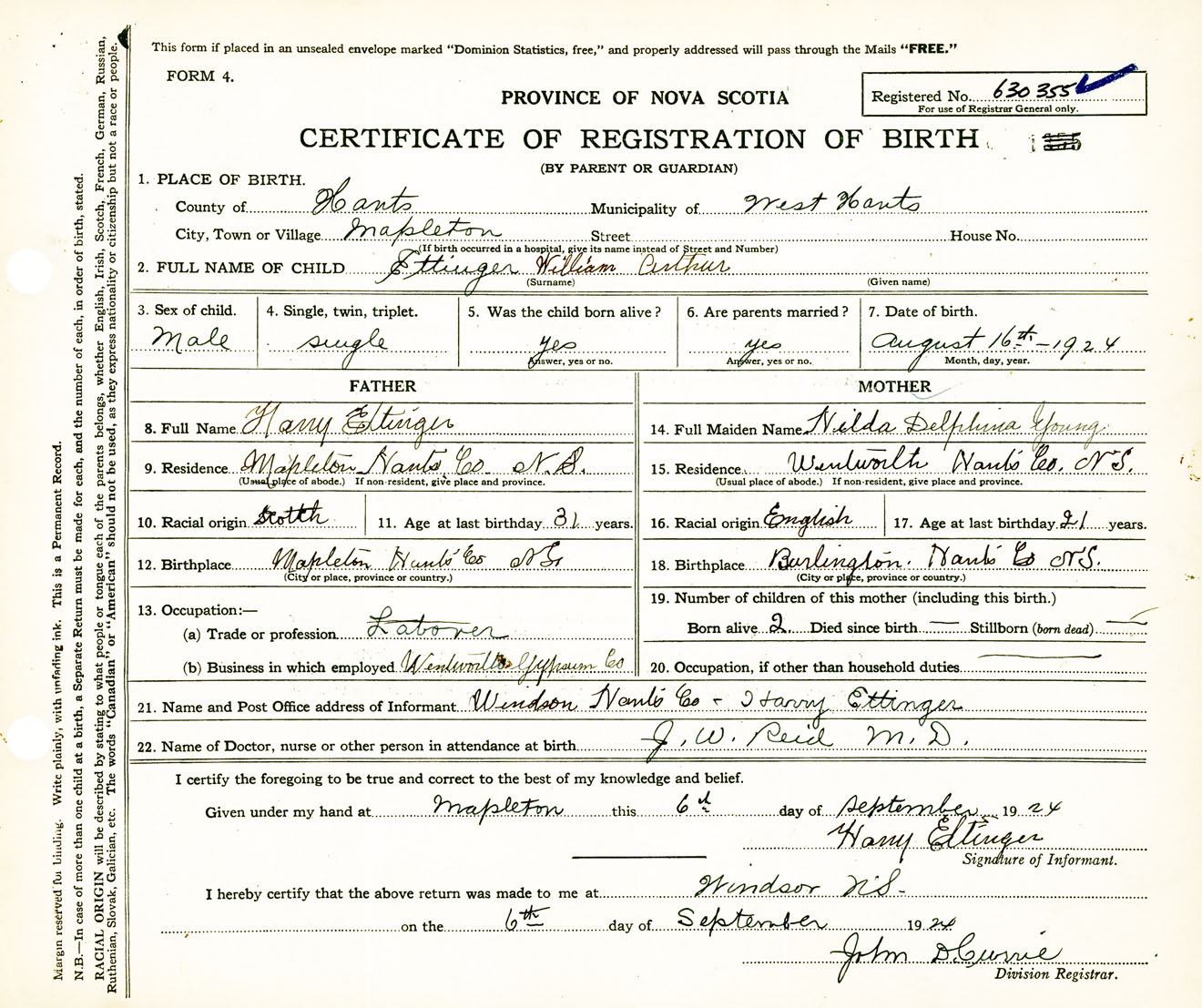 Male Birth Registration: Year: 1924 number: 63000355