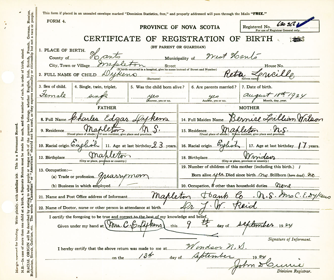 Female Birth Registration: Year: 1924 number: 63000356