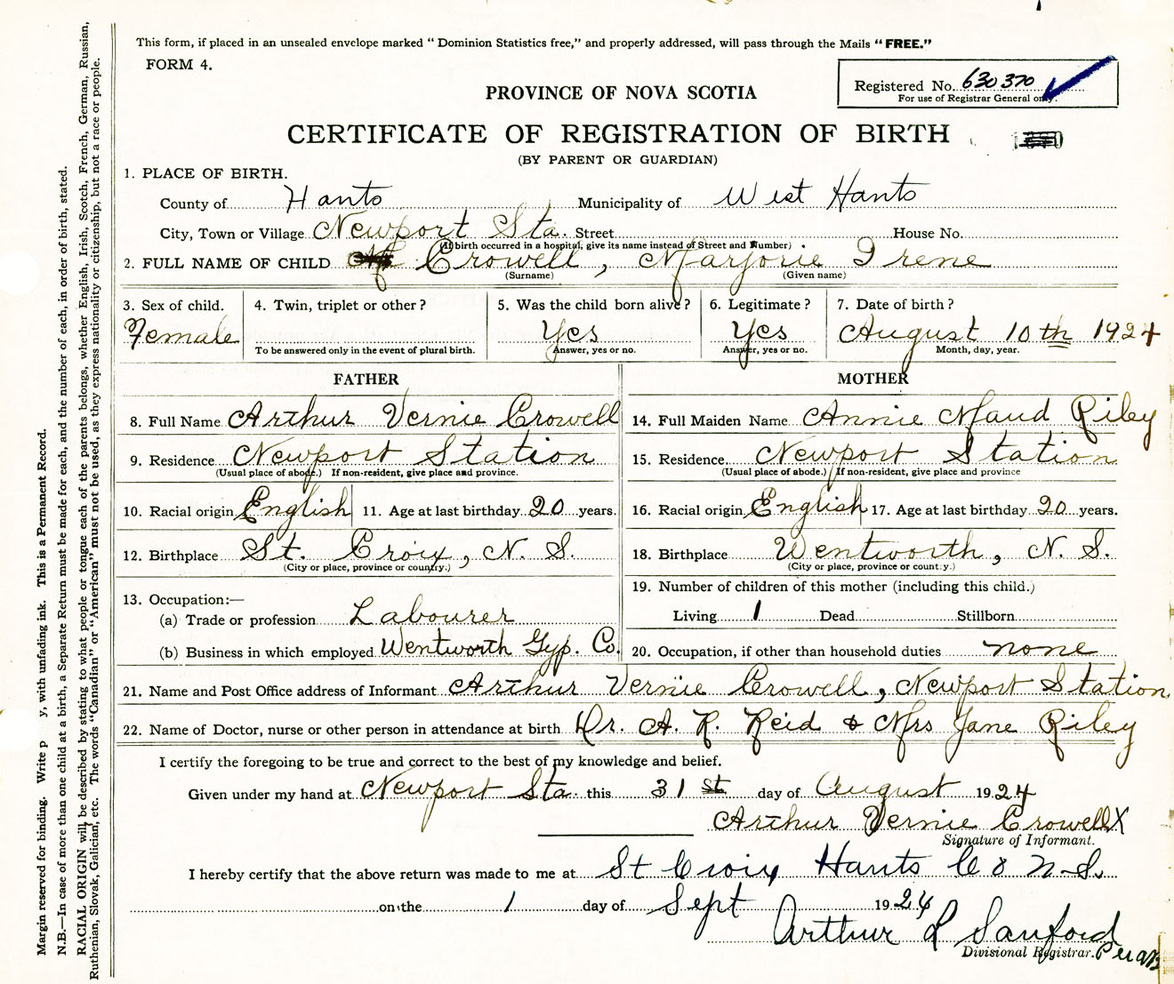 Female Birth Registration: Year: 1924 number: 63000370