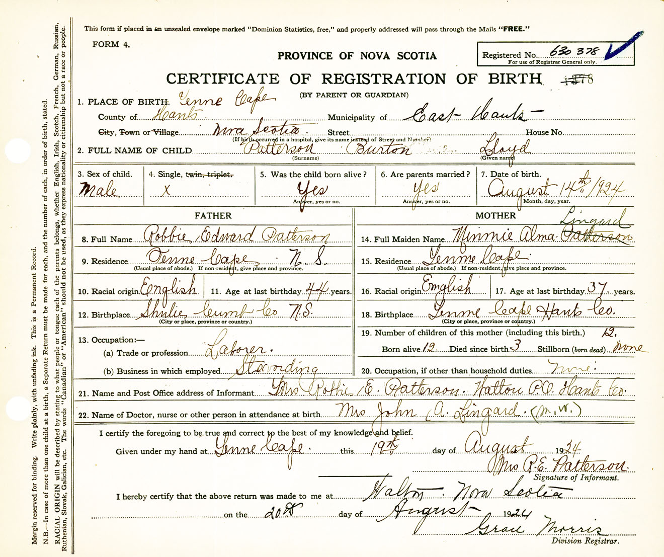 Male Birth Registration: Year: 1924 number: 63000378