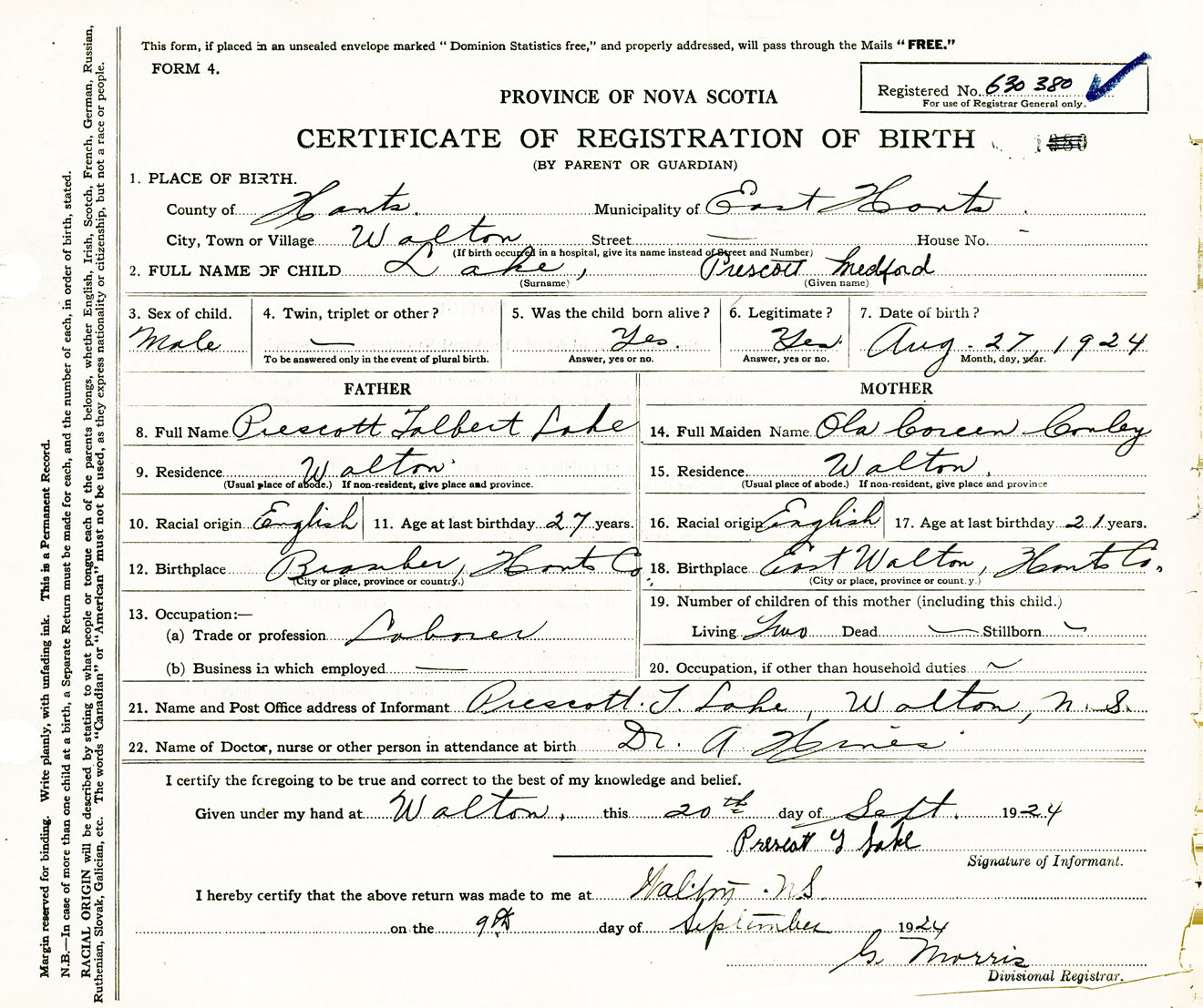 Male Birth Registration: Year: 1924 number: 63000380