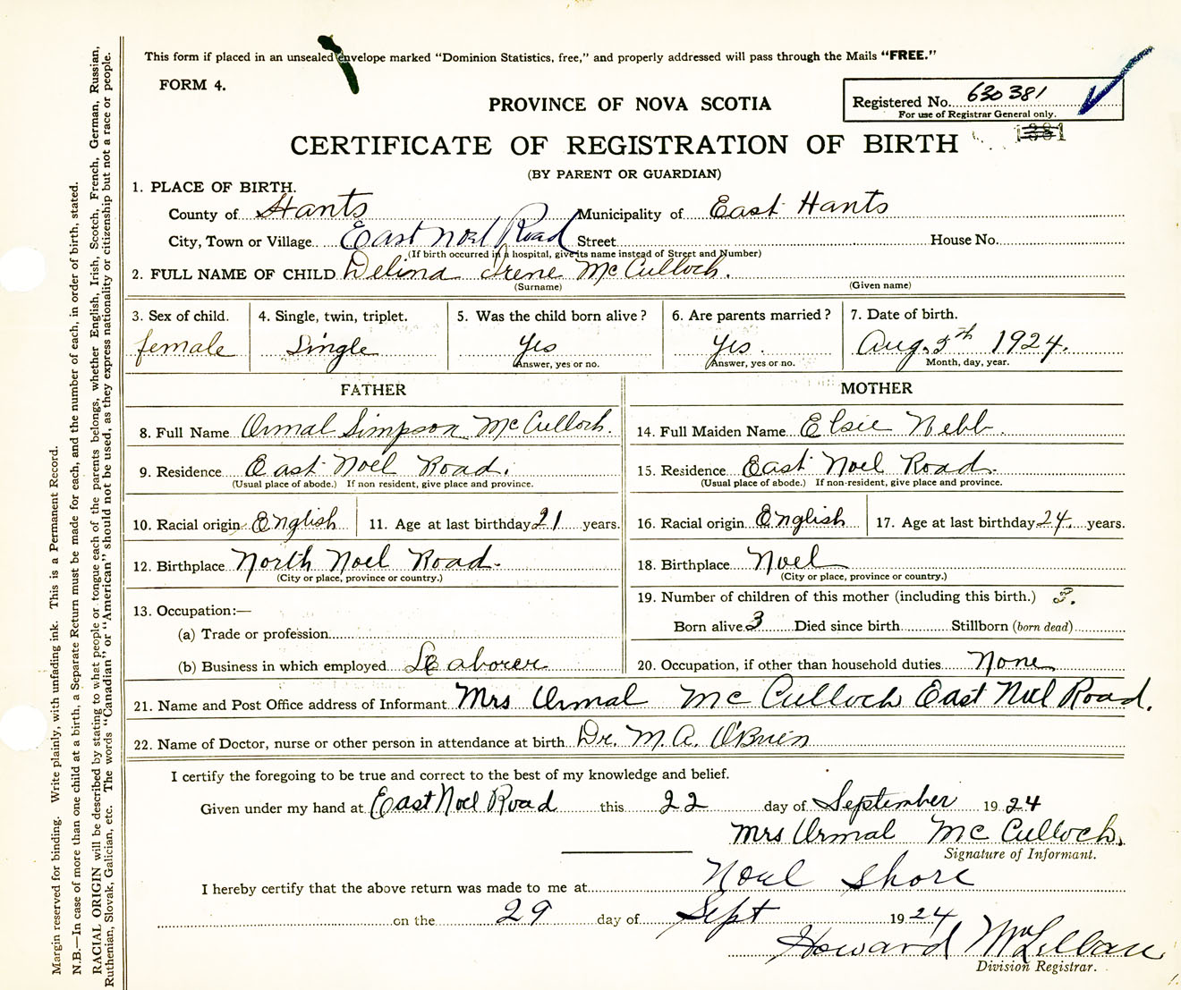 Female Birth Registration: Year: 1924 number: 63000381