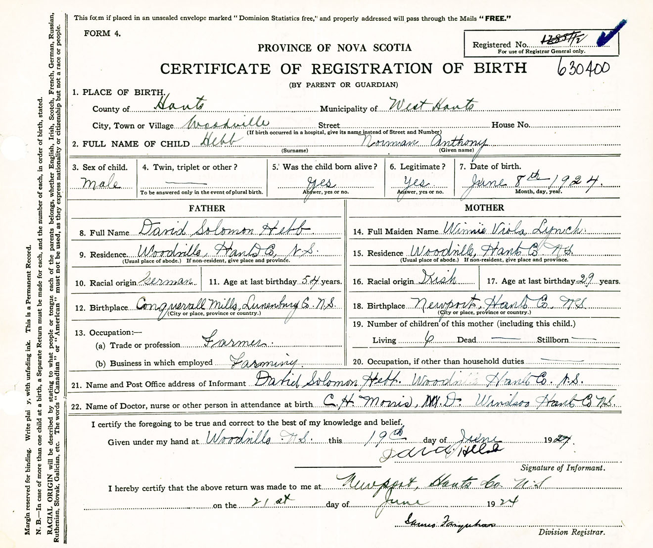 Male Birth Registration: Year: 1924 number: 63000400