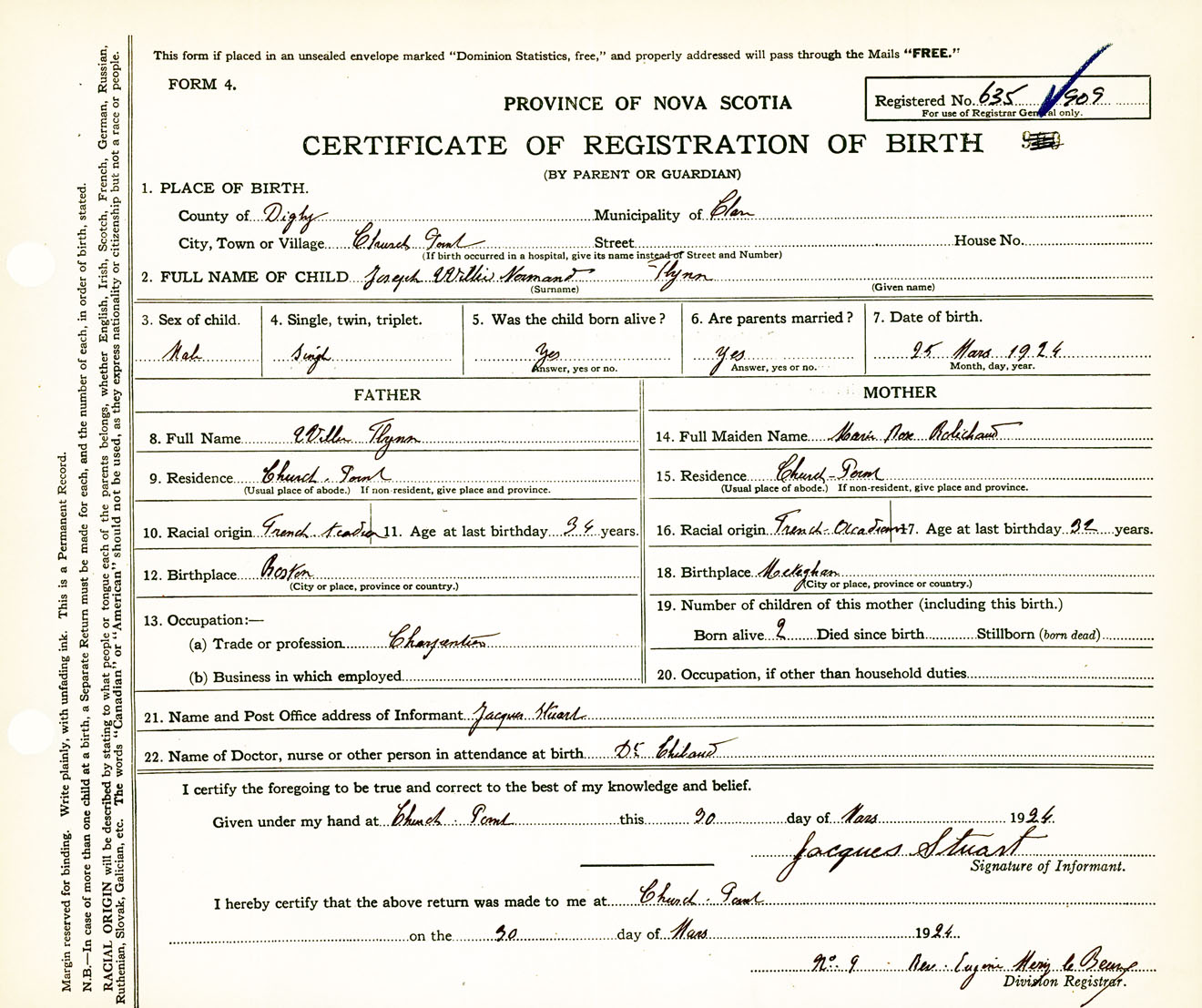 Male Birth Registration: Year: 1924 number: 63500909