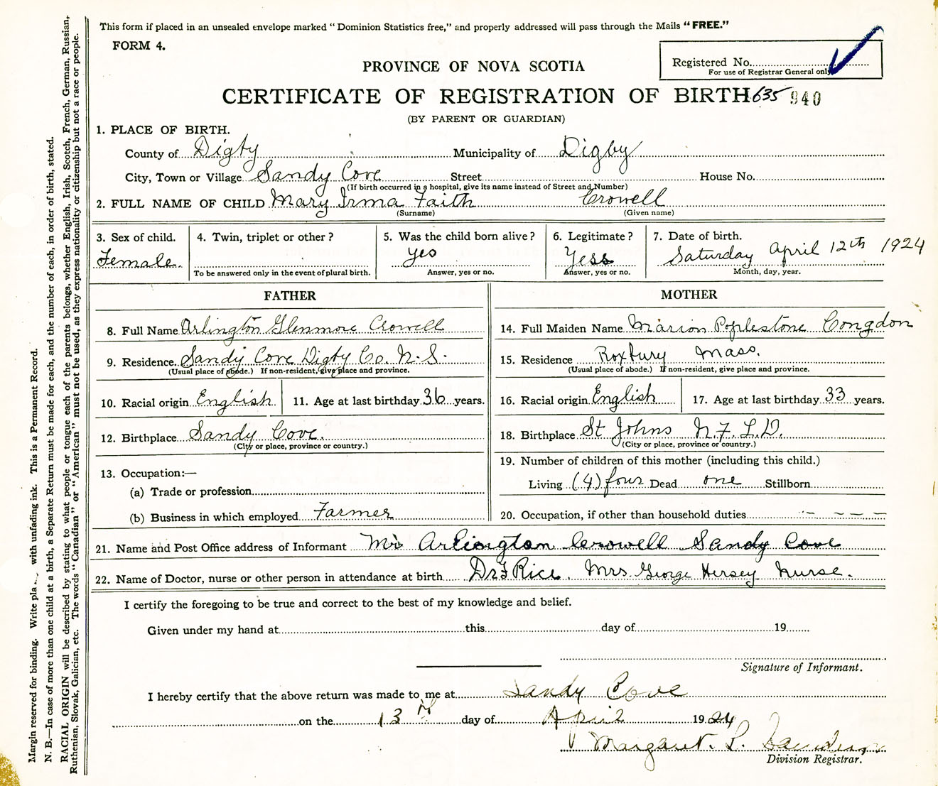 Female Birth Registration: Year: 1924 number: 63500940