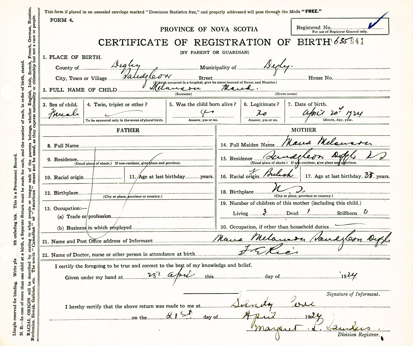 Female Birth Registration: Year: 1924 number: 63500941