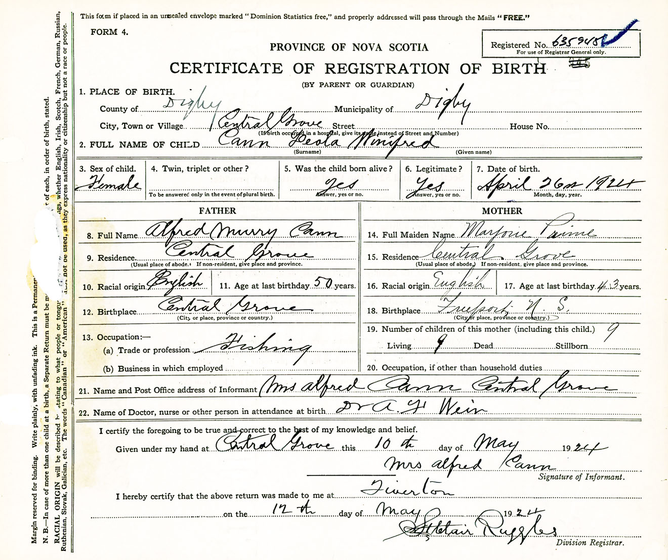 Female Birth Registration: Year: 1924 number: 63500945