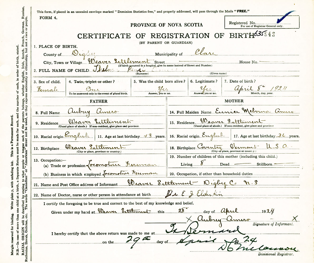 Female Birth Registration: Year: 1924 number: 63500946