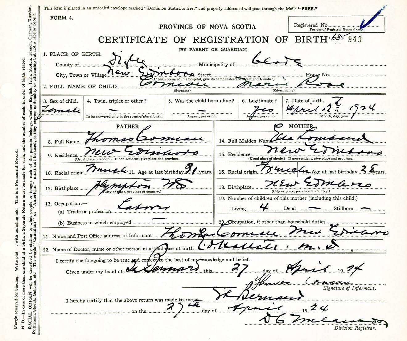 Female Birth Registration: Year: 1924 number: 63500949