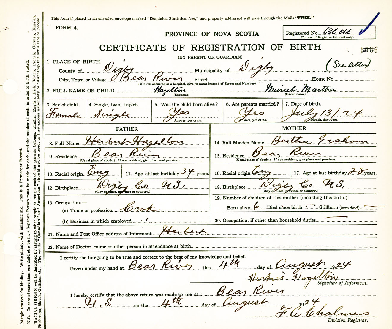 Female Birth Registration: Year: 1924 number: 63600066