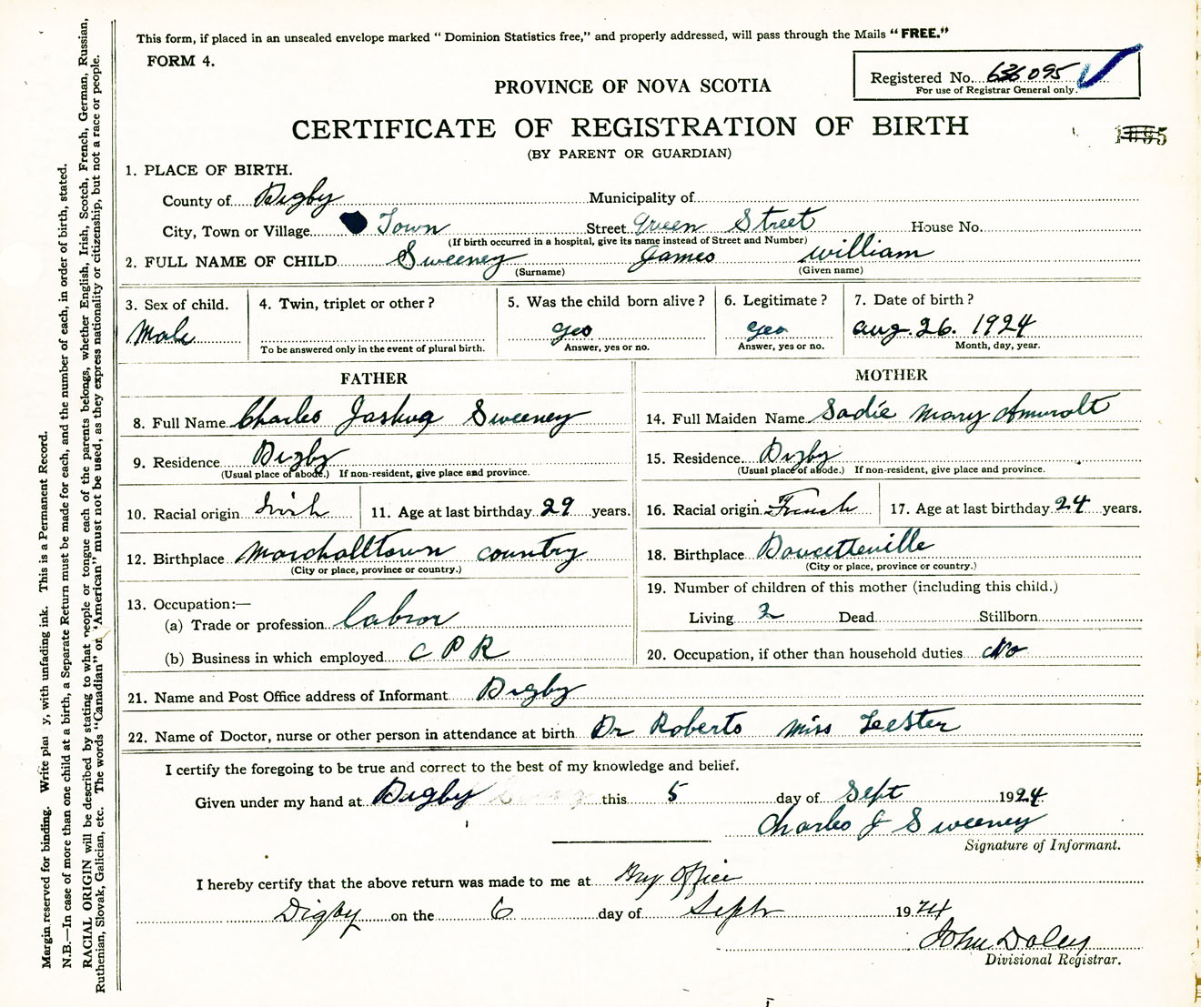 Male Birth Registration: Year: 1924 number: 63600095