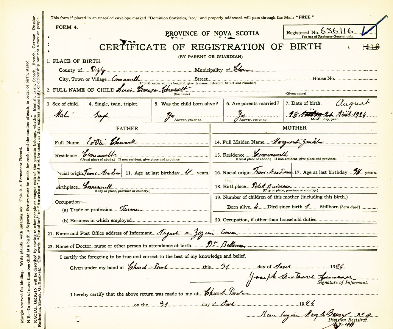 Male Birth Registration: Year: 1924 number: 63600116