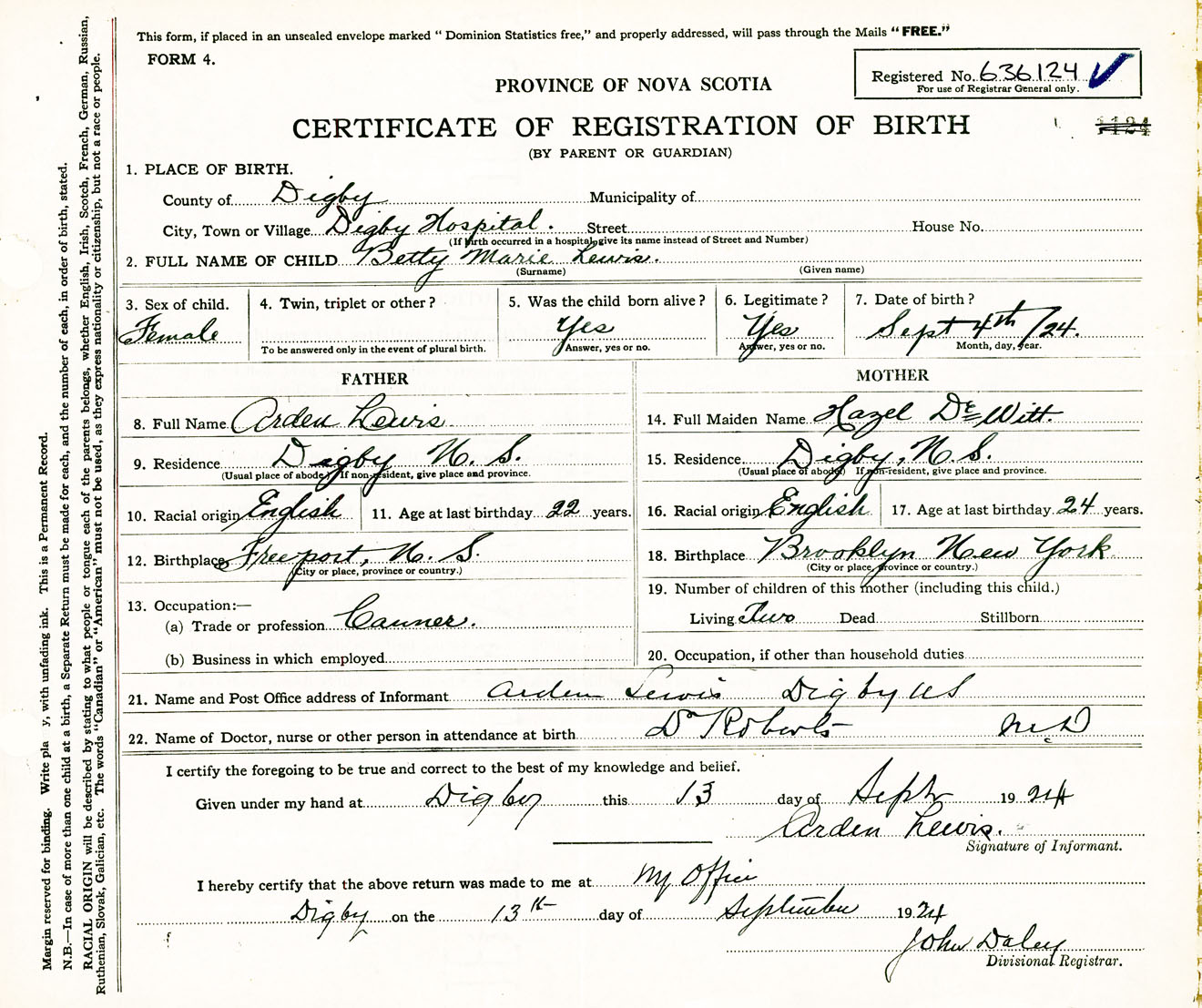 Female Birth Registration: Year: 1924 number: 63600124