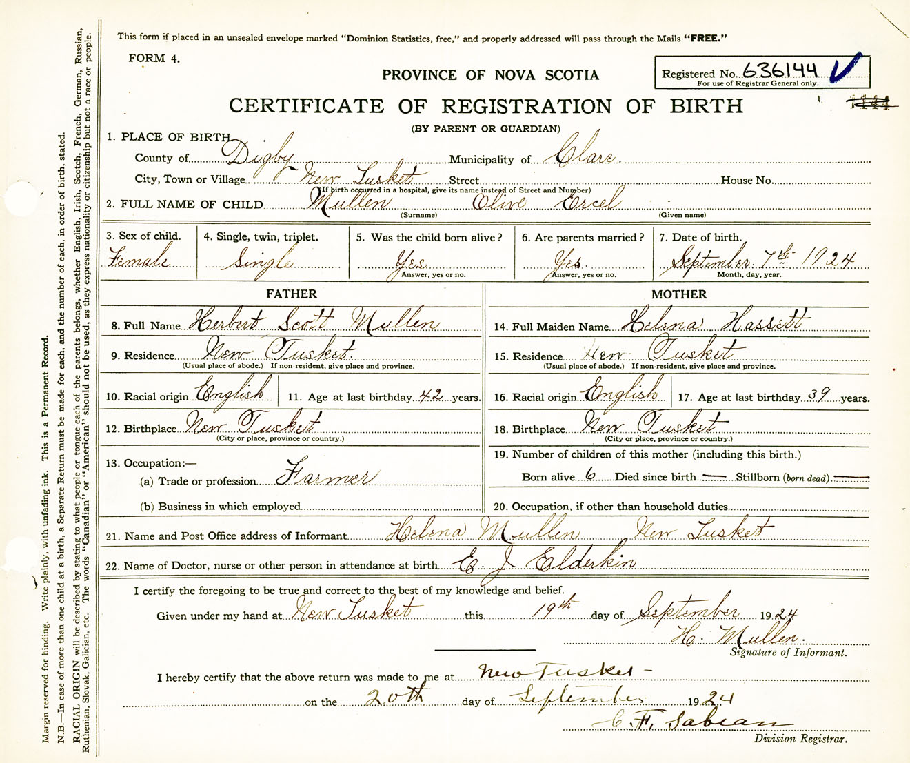 Female Birth Registration: Year: 1924 number: 63600144