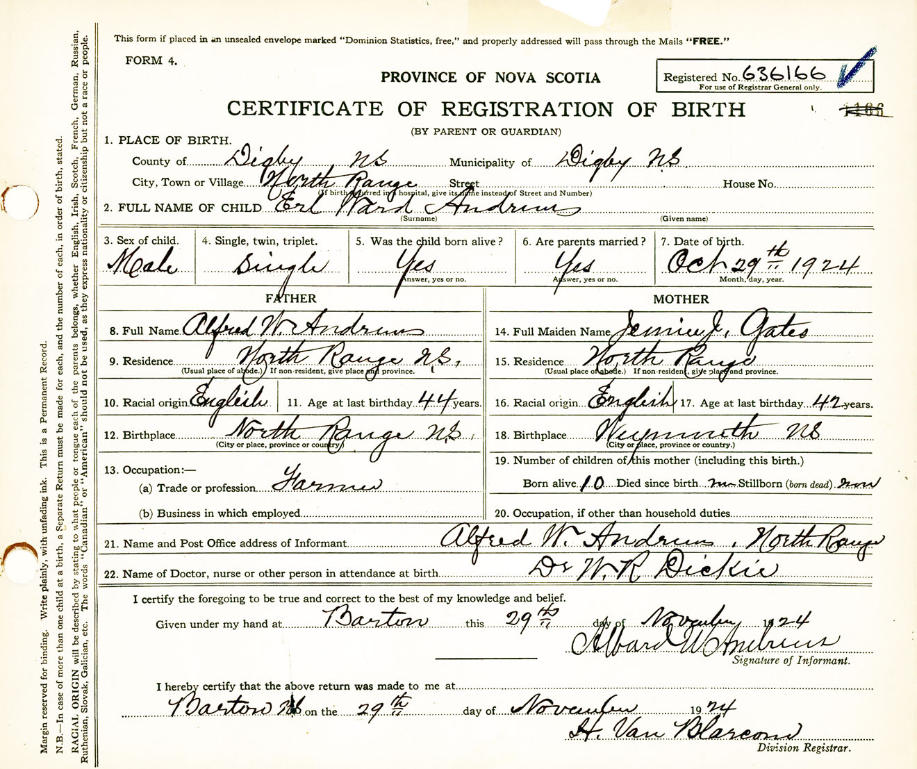Male Birth Registration: Year: 1924 number: 63600166
