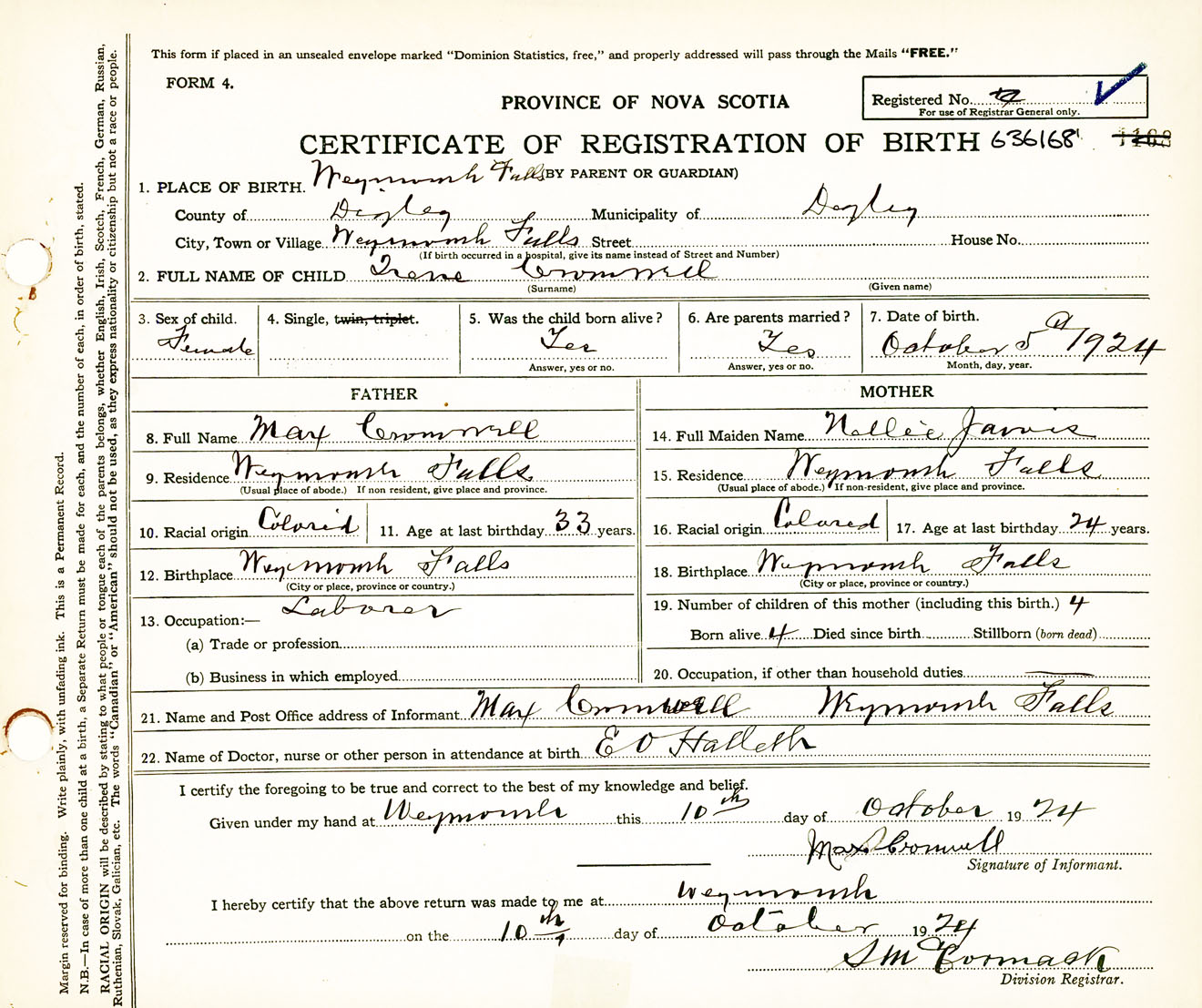 Female Birth Registration: Year: 1924 number: 63600168