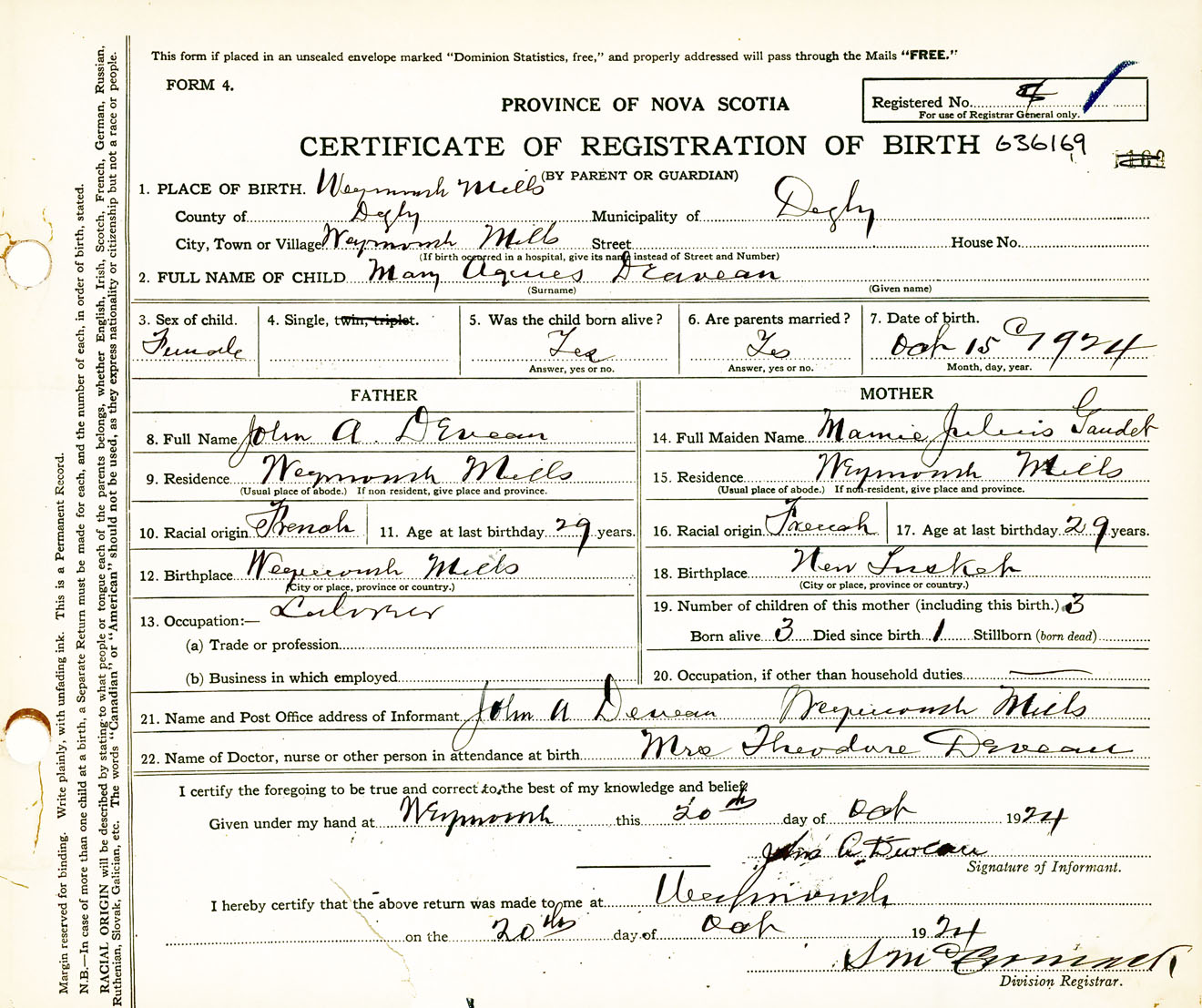 Female Birth Registration: Year: 1924 number: 63600169