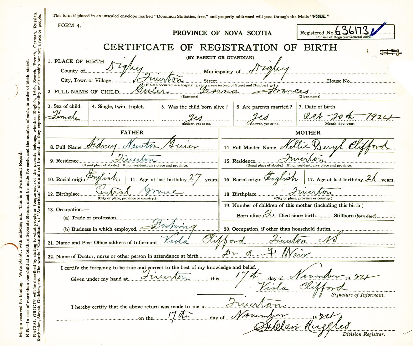 Female Birth Registration: Year: 1924 number: 63600173