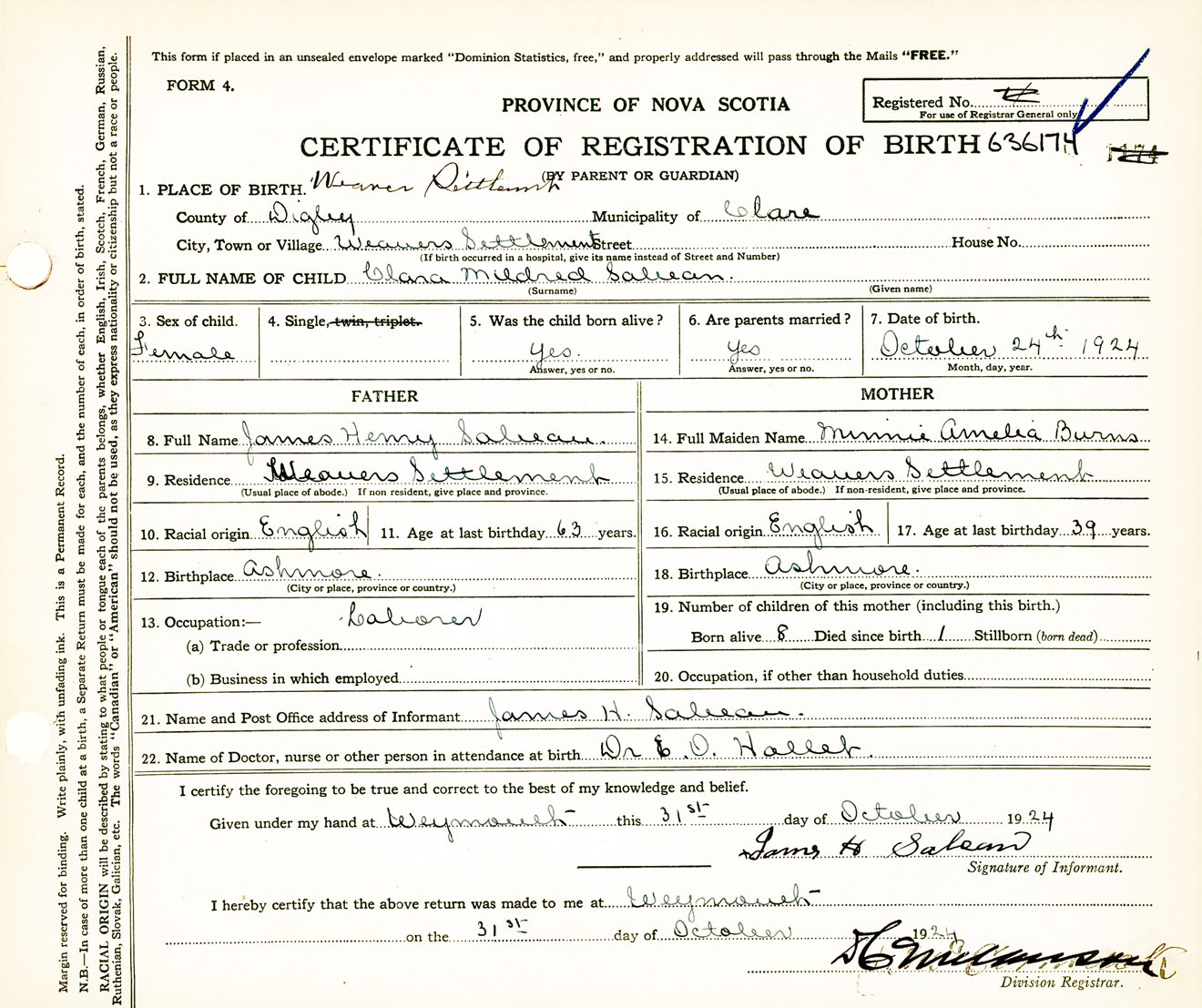 Female Birth Registration: Year: 1924 number: 63600174