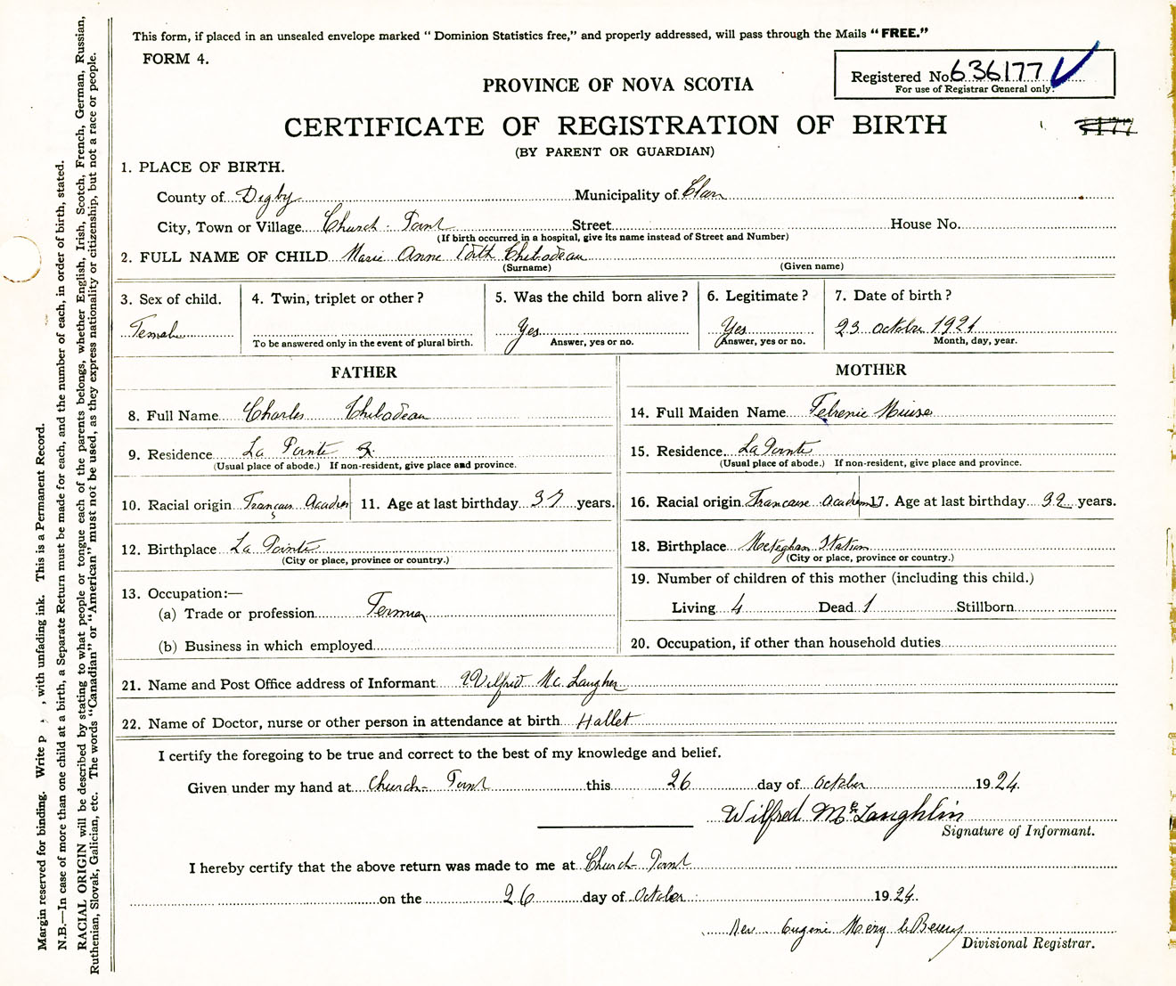 Female Birth Registration: Year: 1924 number: 63600177