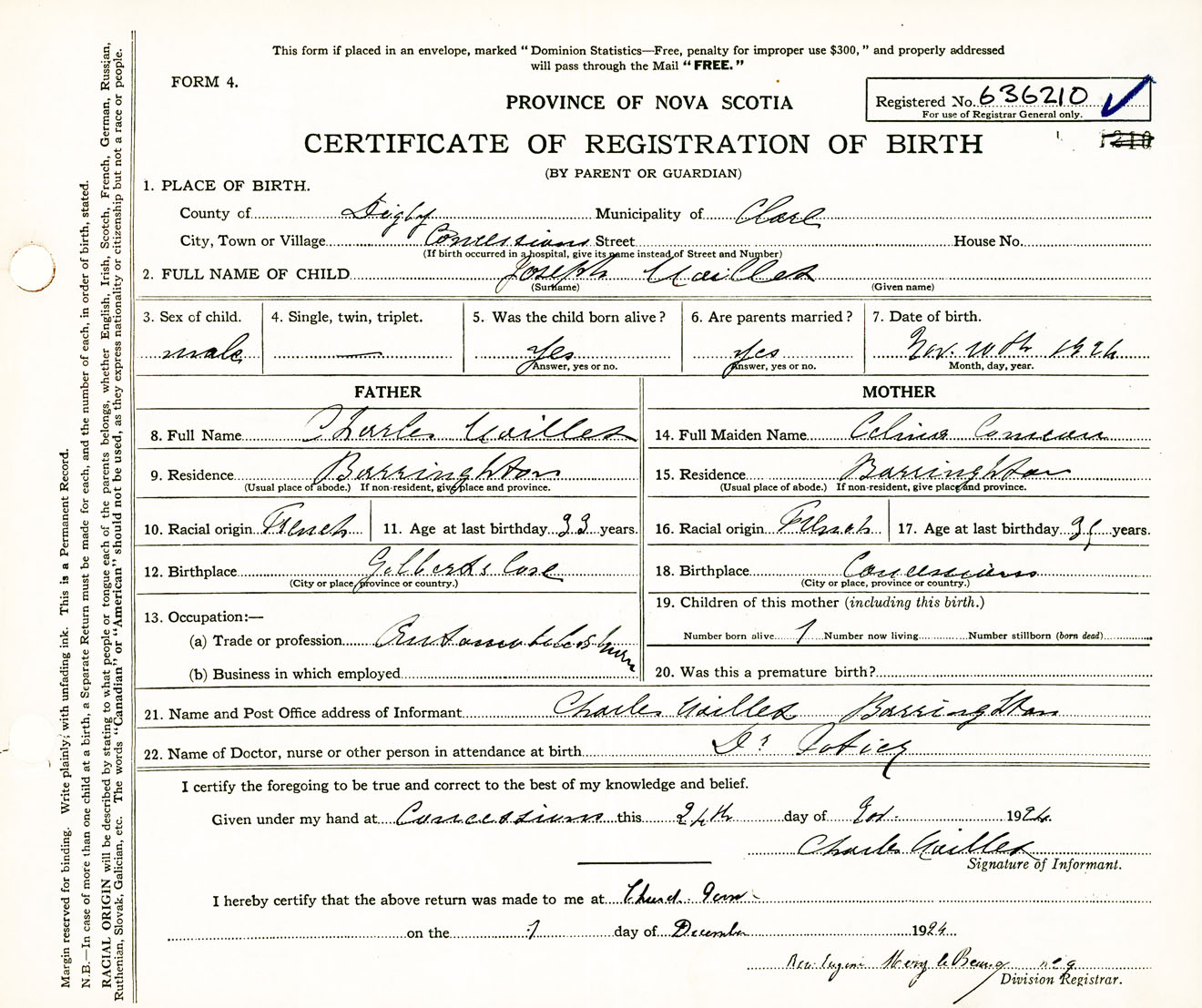 Male Birth Registration: Year: 1924 number: 63600210