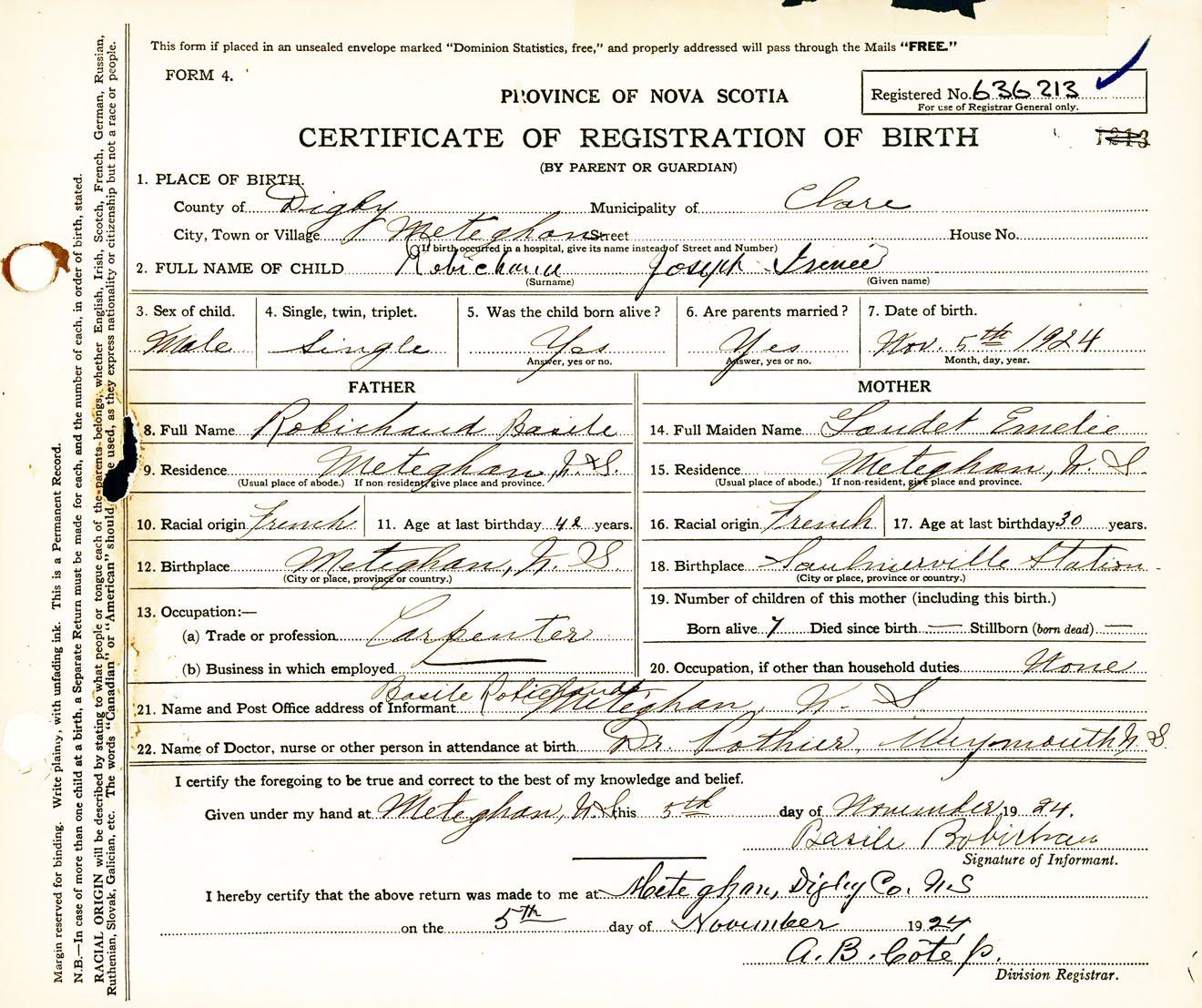 Male Birth Registration: Year: 1924 number: 63600213
