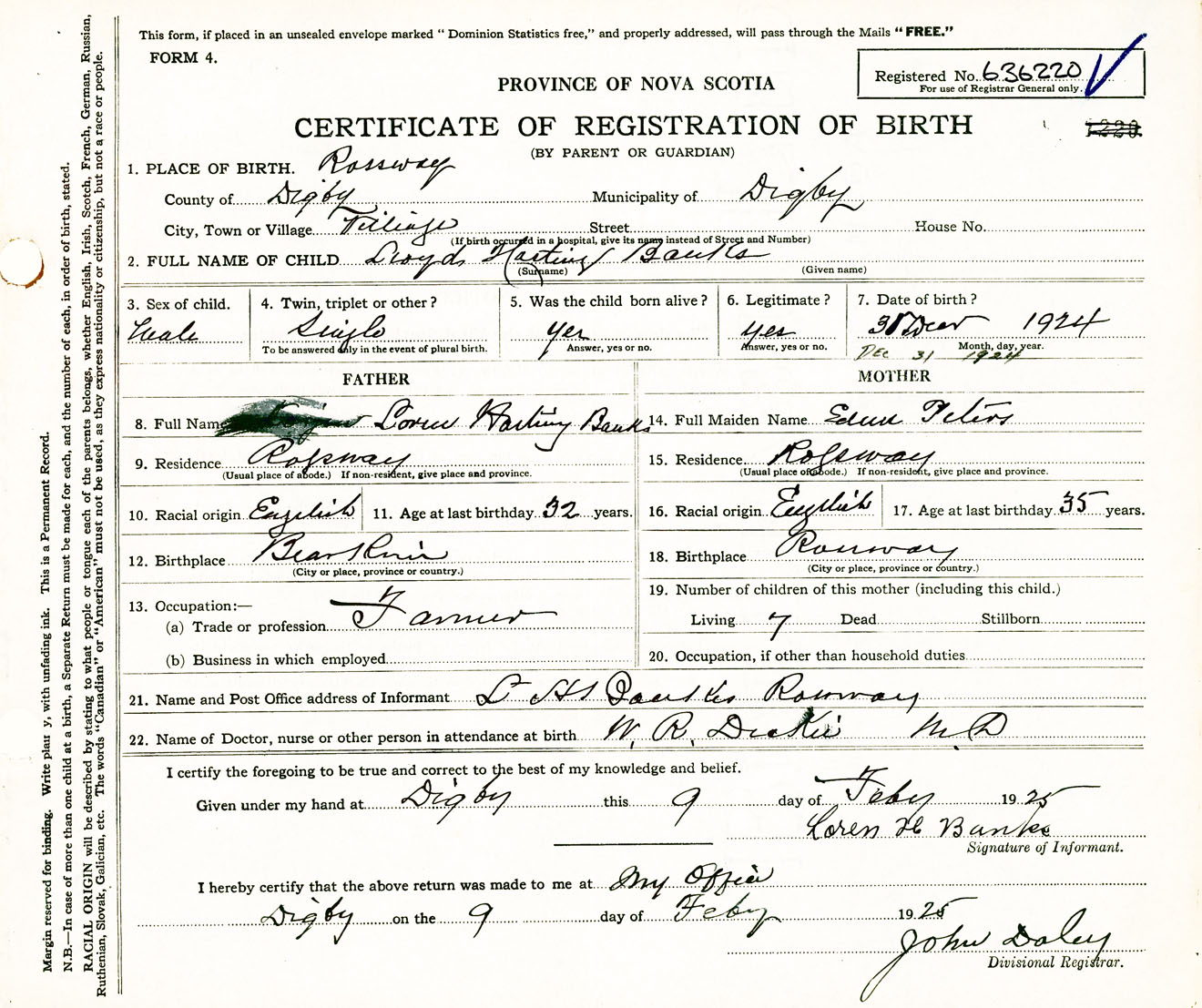Male Birth Registration: Year: 1924 number: 63600220