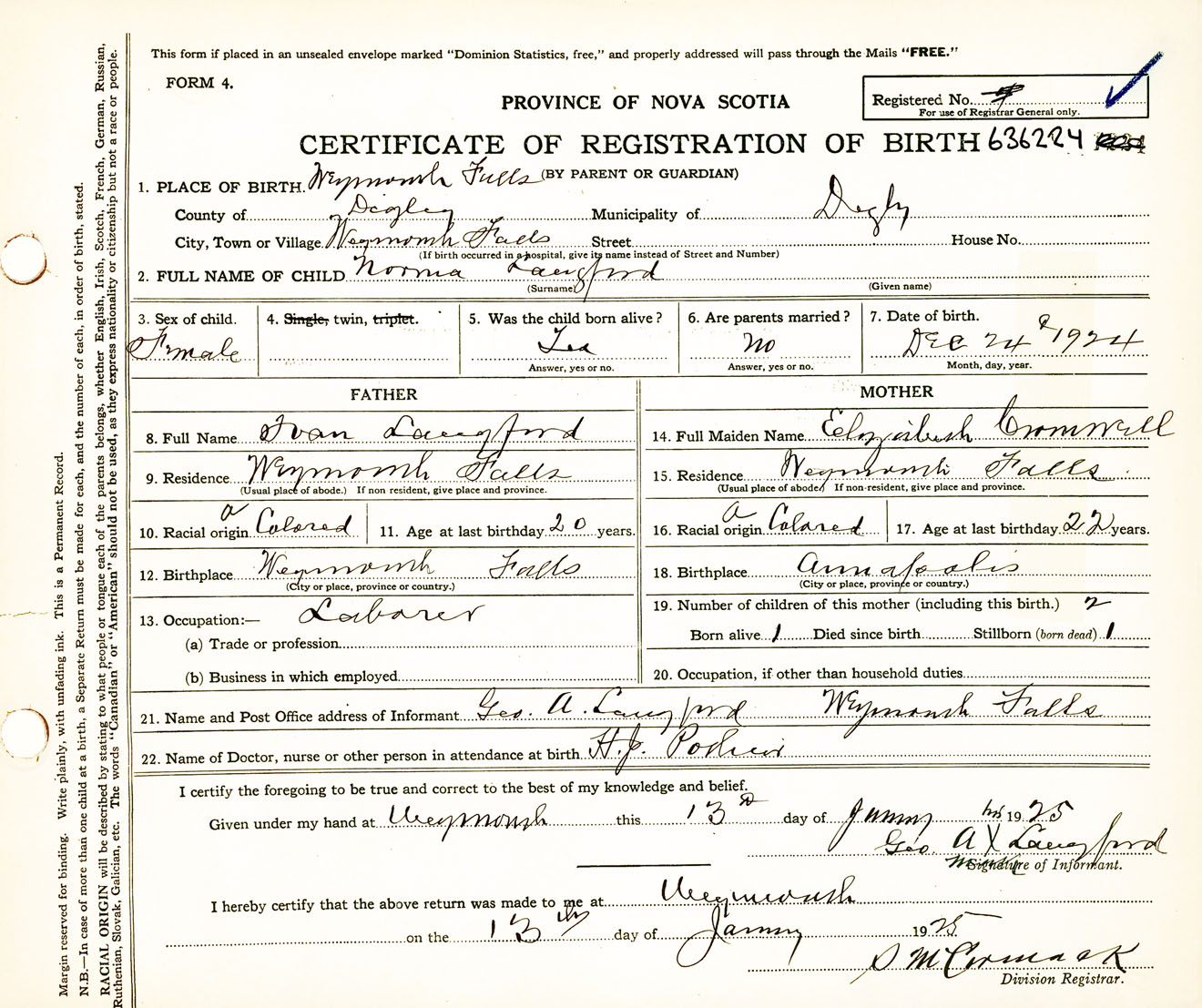 Female Birth Registration: Year: 1924 number: 63600224