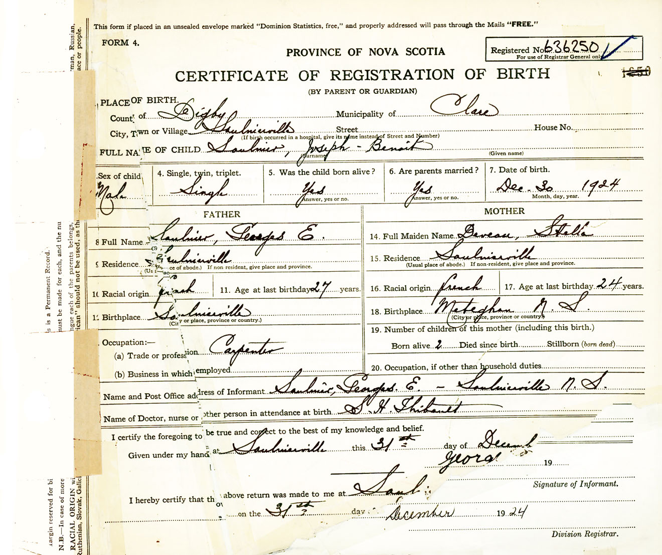 Male Birth Registration: Year: 1924 number: 63600250