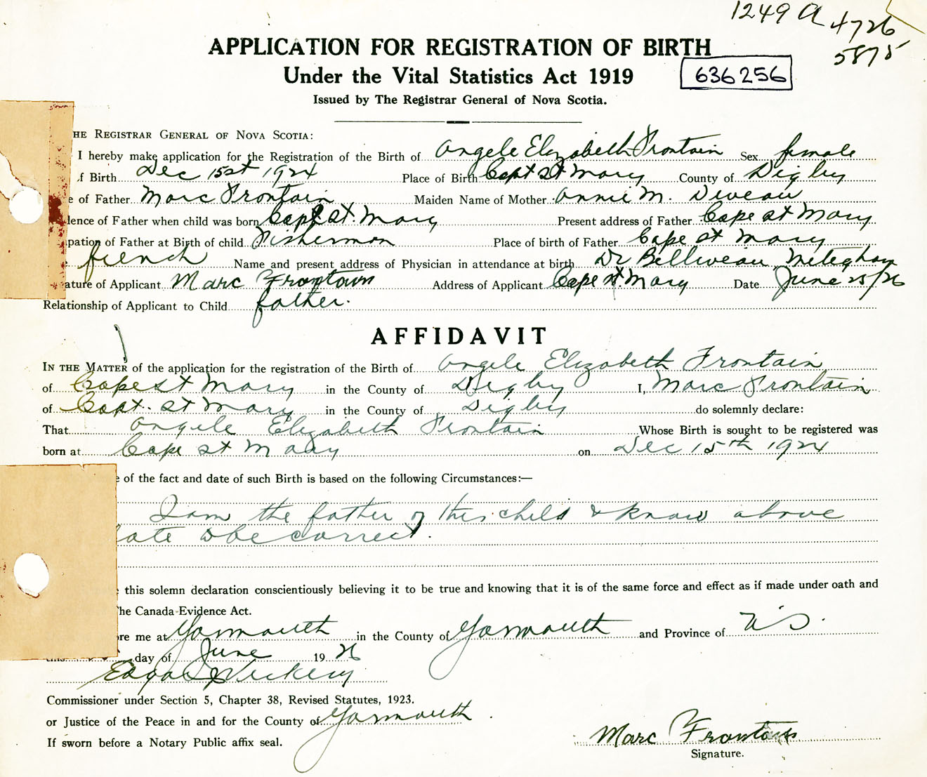 I hereby make application for the Registration of Birth of Angele ElizabethFrontain Sex Female