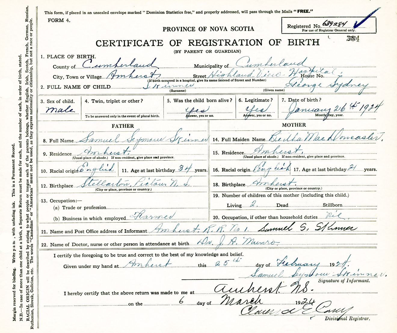 Male Birth Registration: Year: 1924 number: 63900284