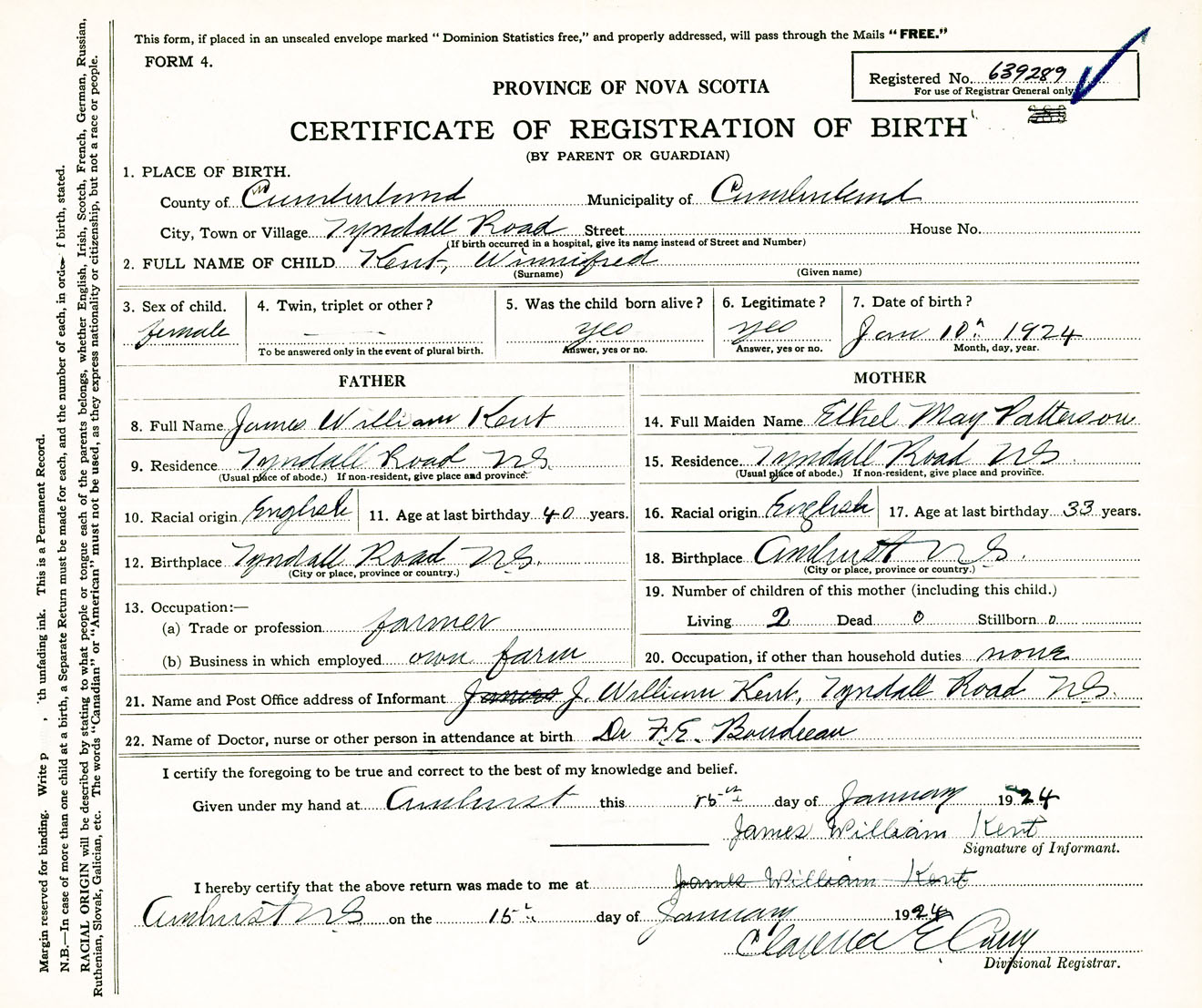 Female Birth Registration: Year: 1924 number: 63900289
