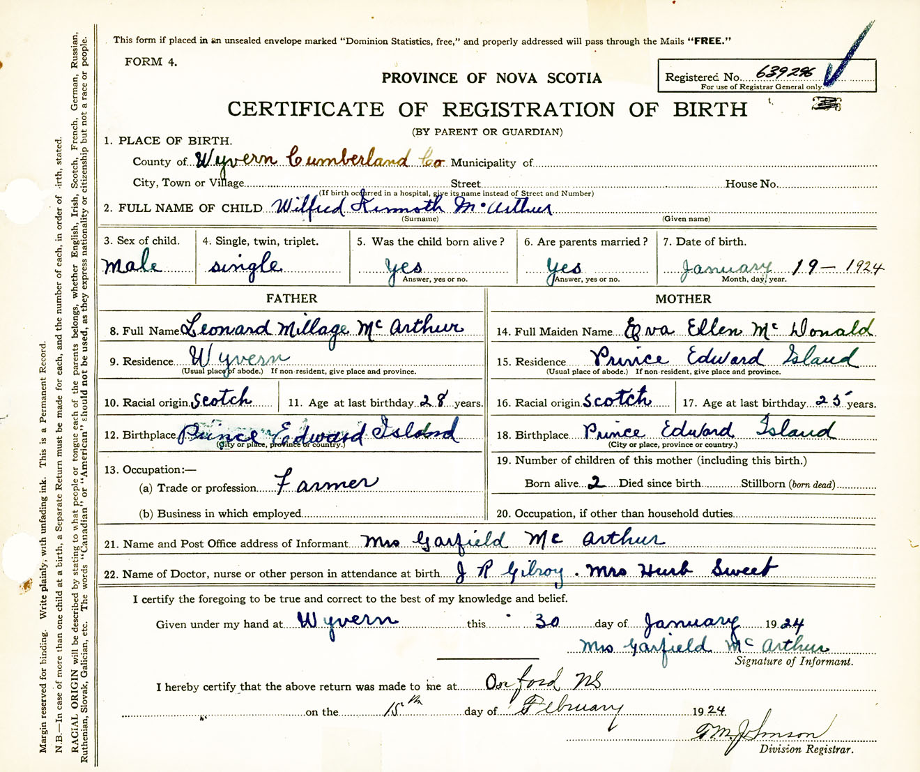 Male Birth Registration: Year: 1924 number: 63900296