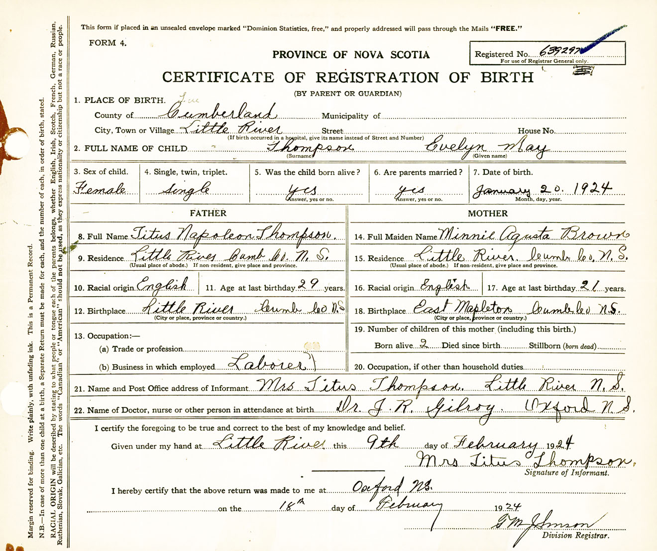 Female Birth Registration: Year: 1924 number: 63900297