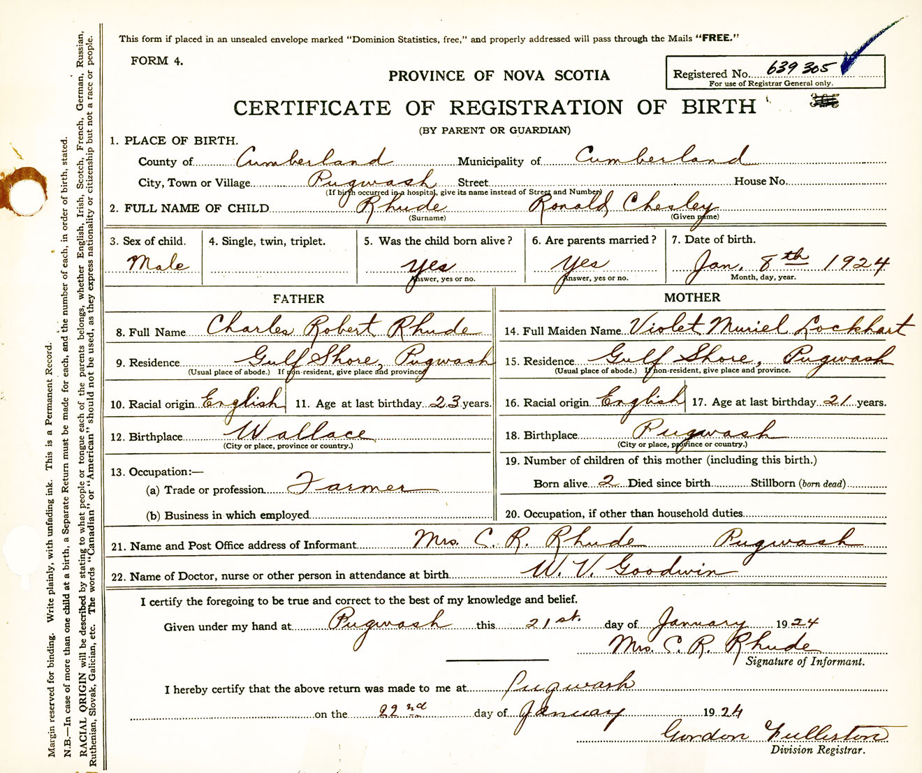 Male Birth Registration: Year: 1924 number: 63900305