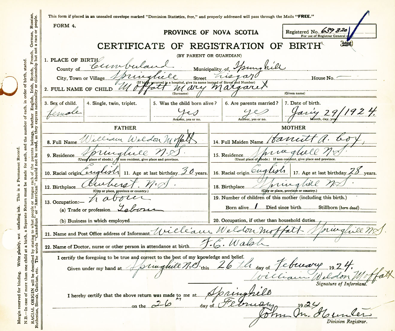 Female Birth Registration: Year: 1924 number: 63900320