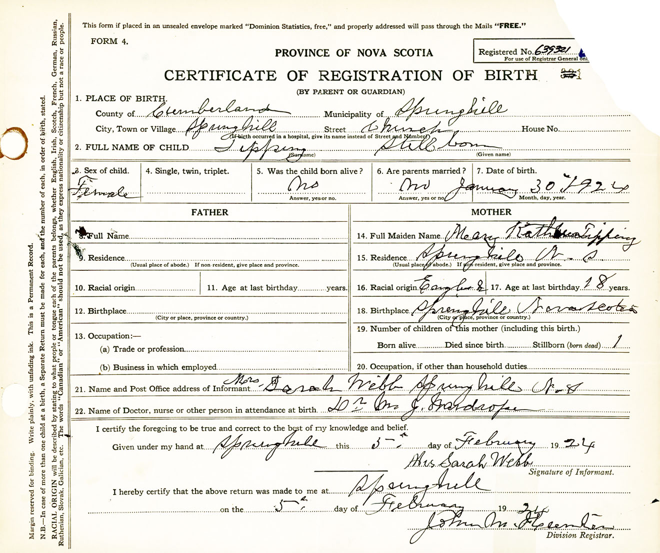 Female Birth Registration: Year: 1924 number: 63900321