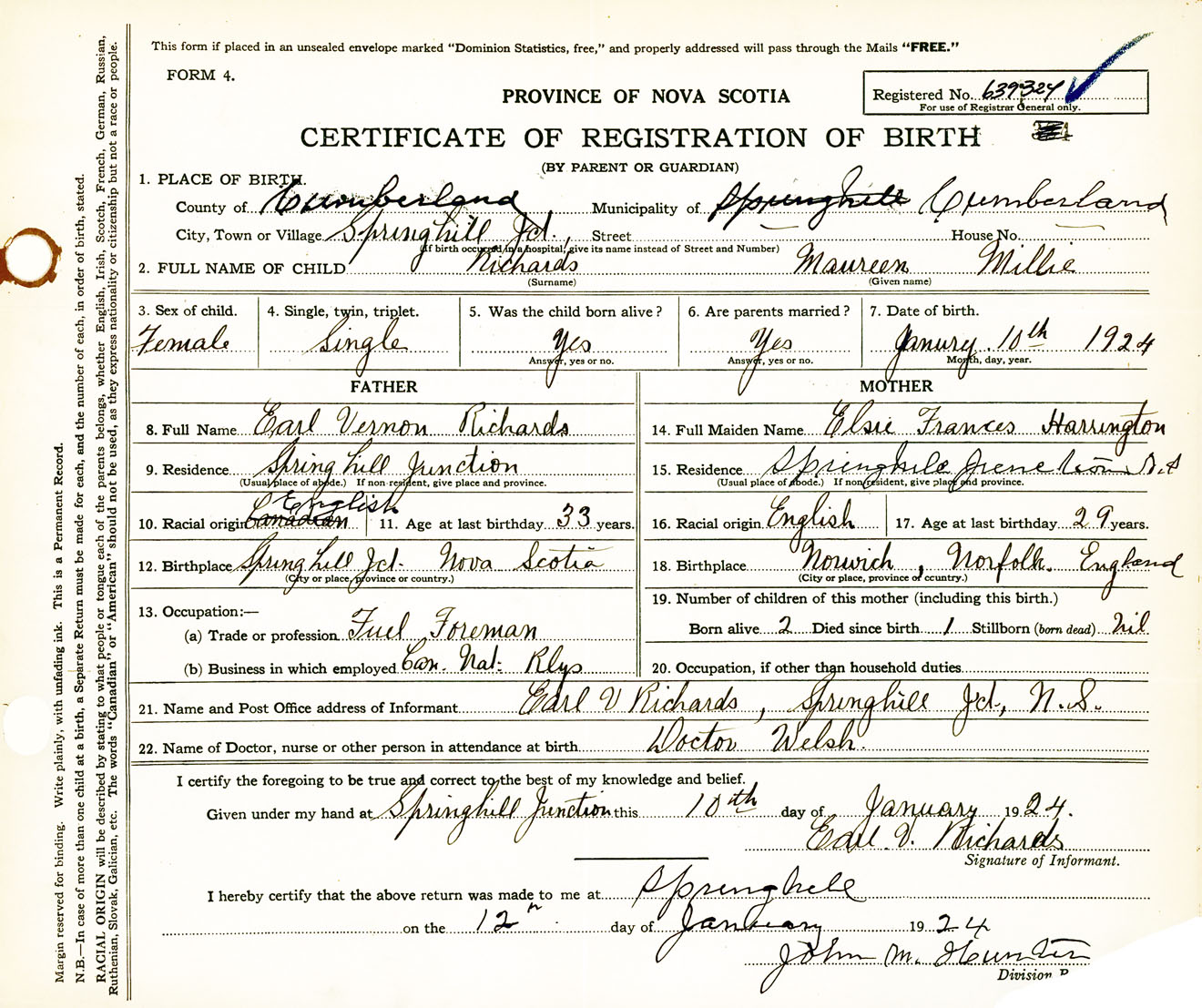 Female Birth Registration: Year: 1924 number: 63900324