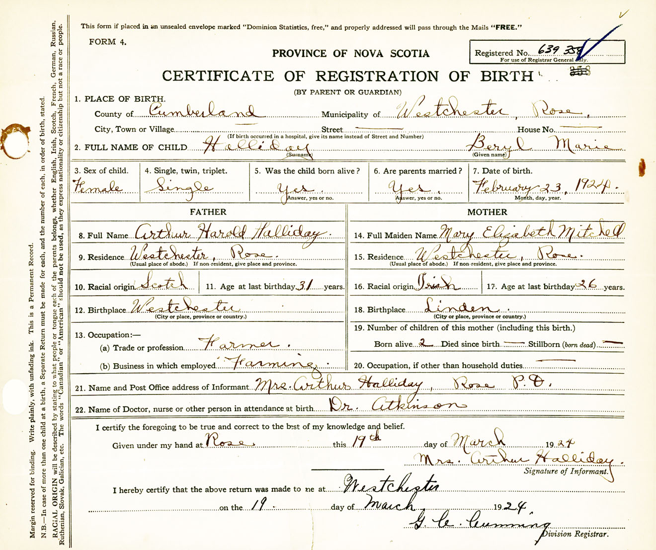 Female Birth Registration: Year: 1924 number: 63900358
