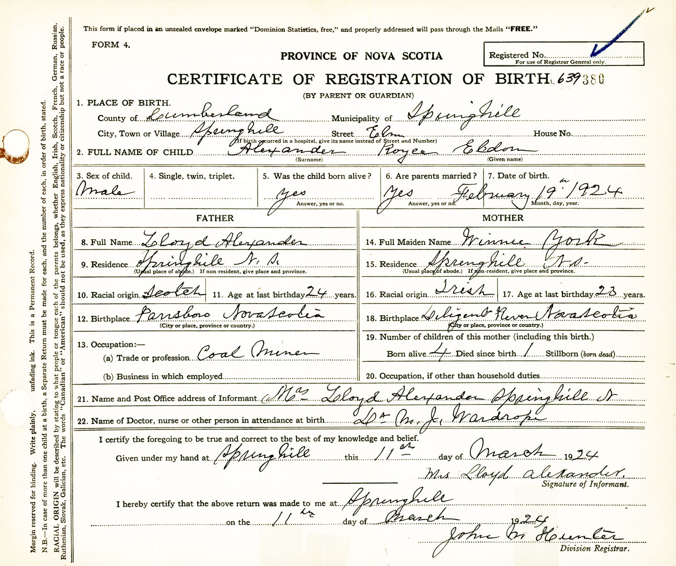 Male Birth Registration: Year: 1924 number: 63900380