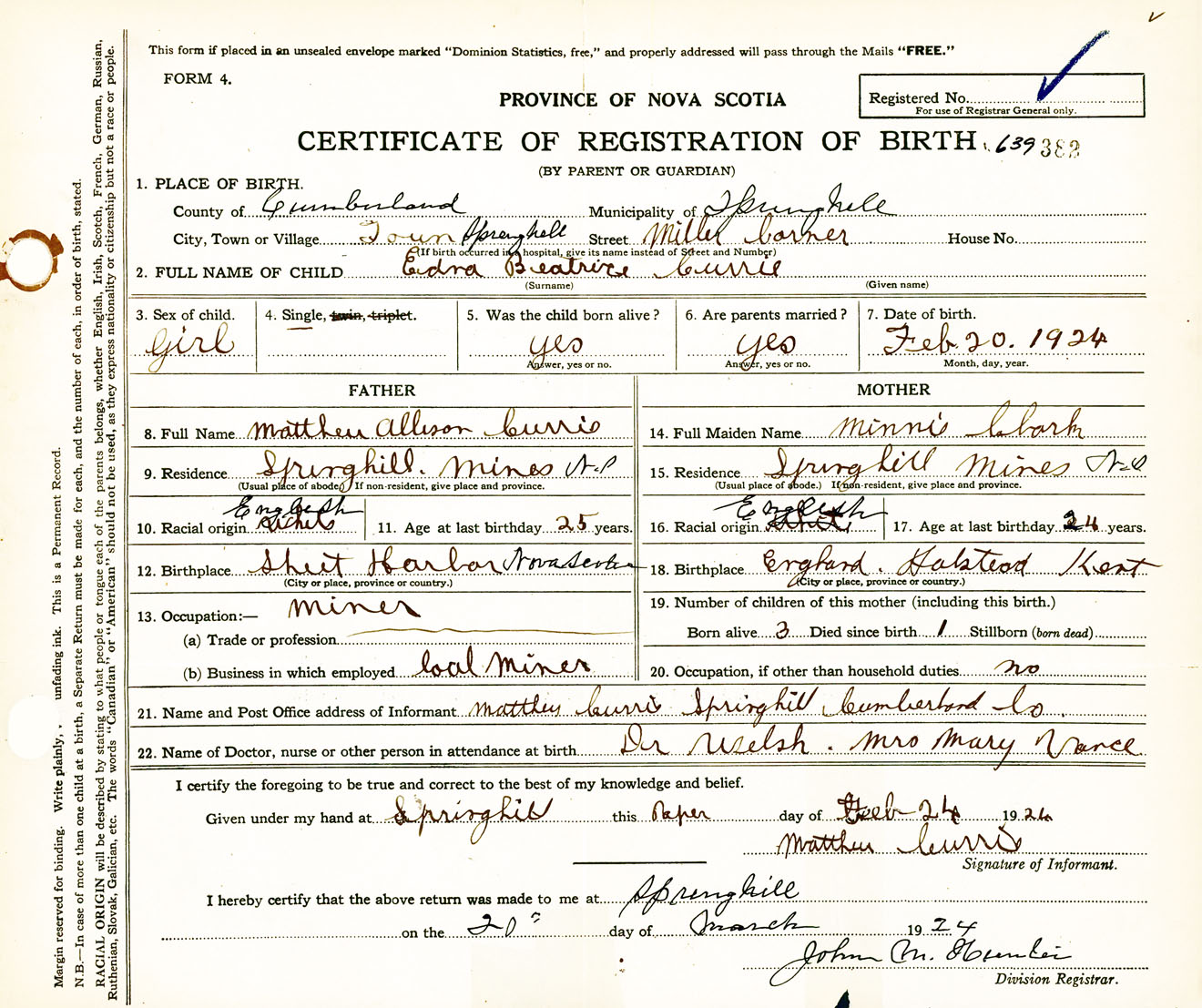 Female Birth Registration: Year: 1924 number: 63900382