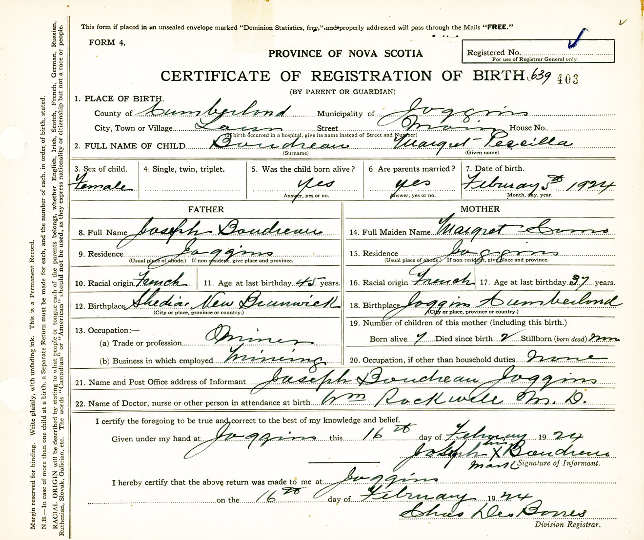 Female Birth Registration: Year: 1924 number: 63900403