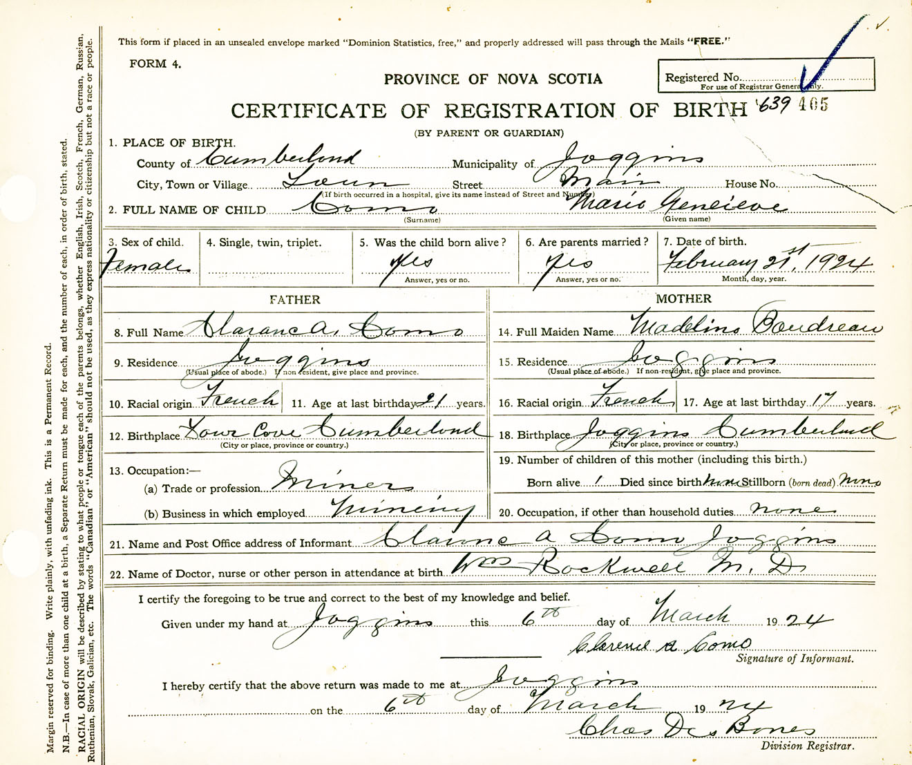Female Birth Registration: Year: 1924 number: 63900405
