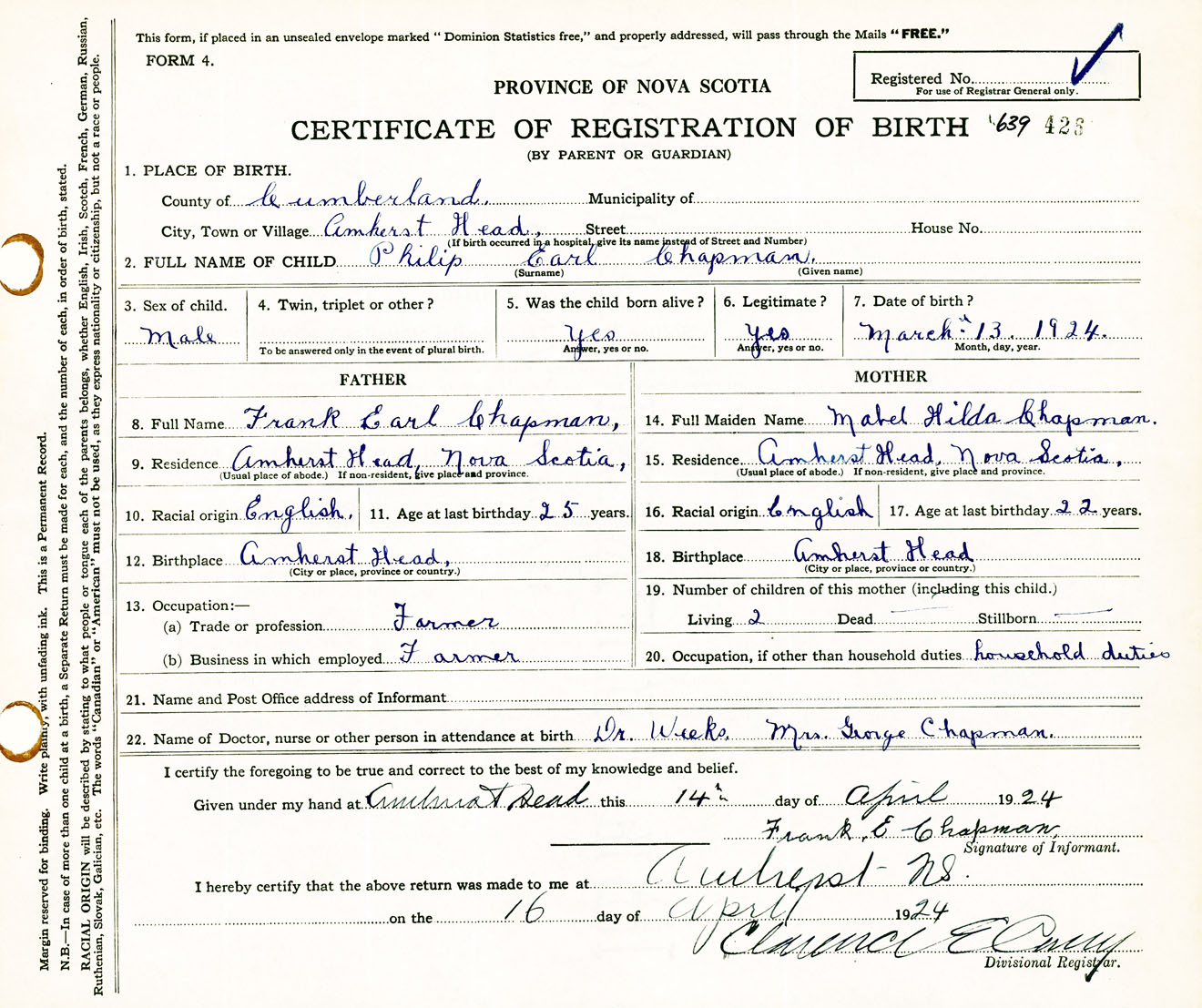 Male Birth Registration: Year: 1924 number: 63900426