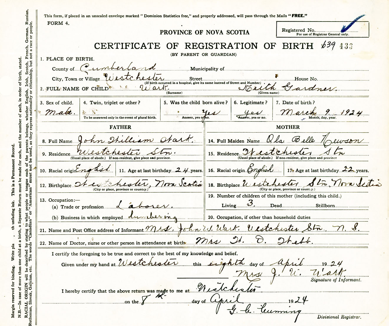 Male Birth Registration: Year: 1924 number: 63900436