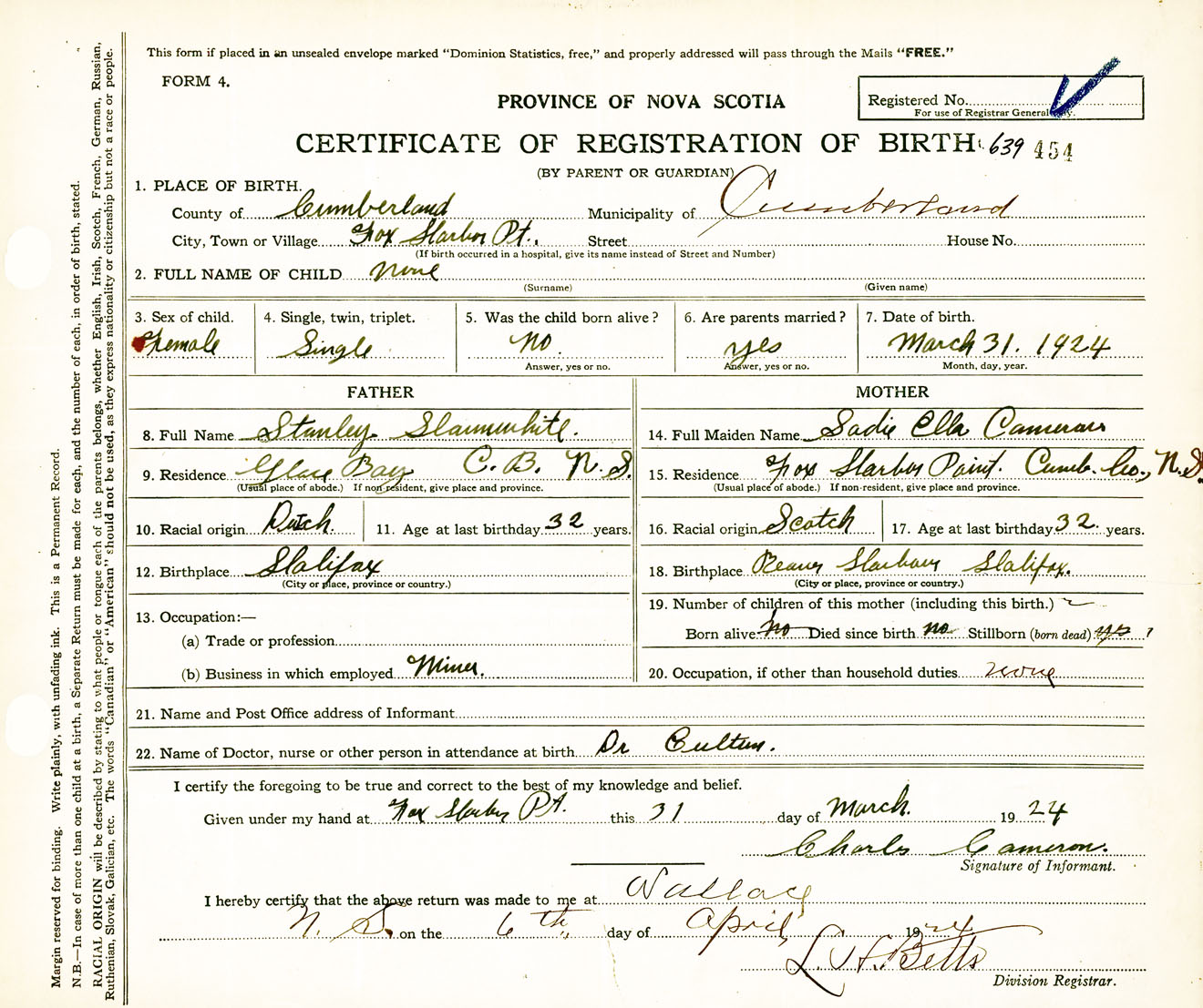 Female Birth Registration: Year: 1924 number: 63900454