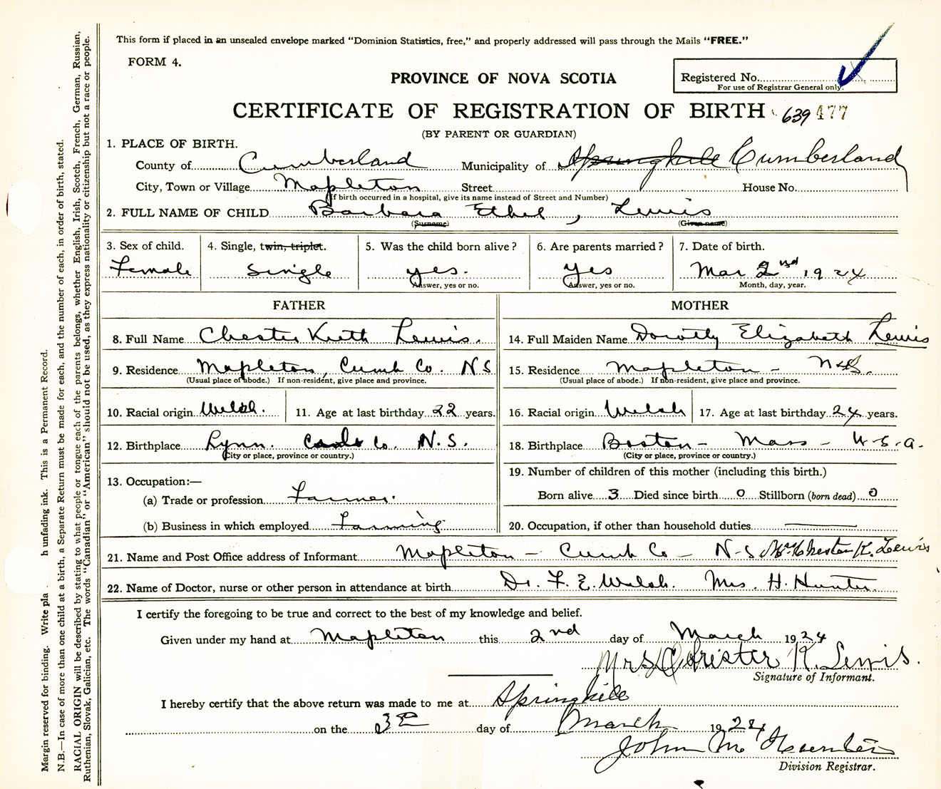 Female Birth Registration: Year: 1924 number: 63900477