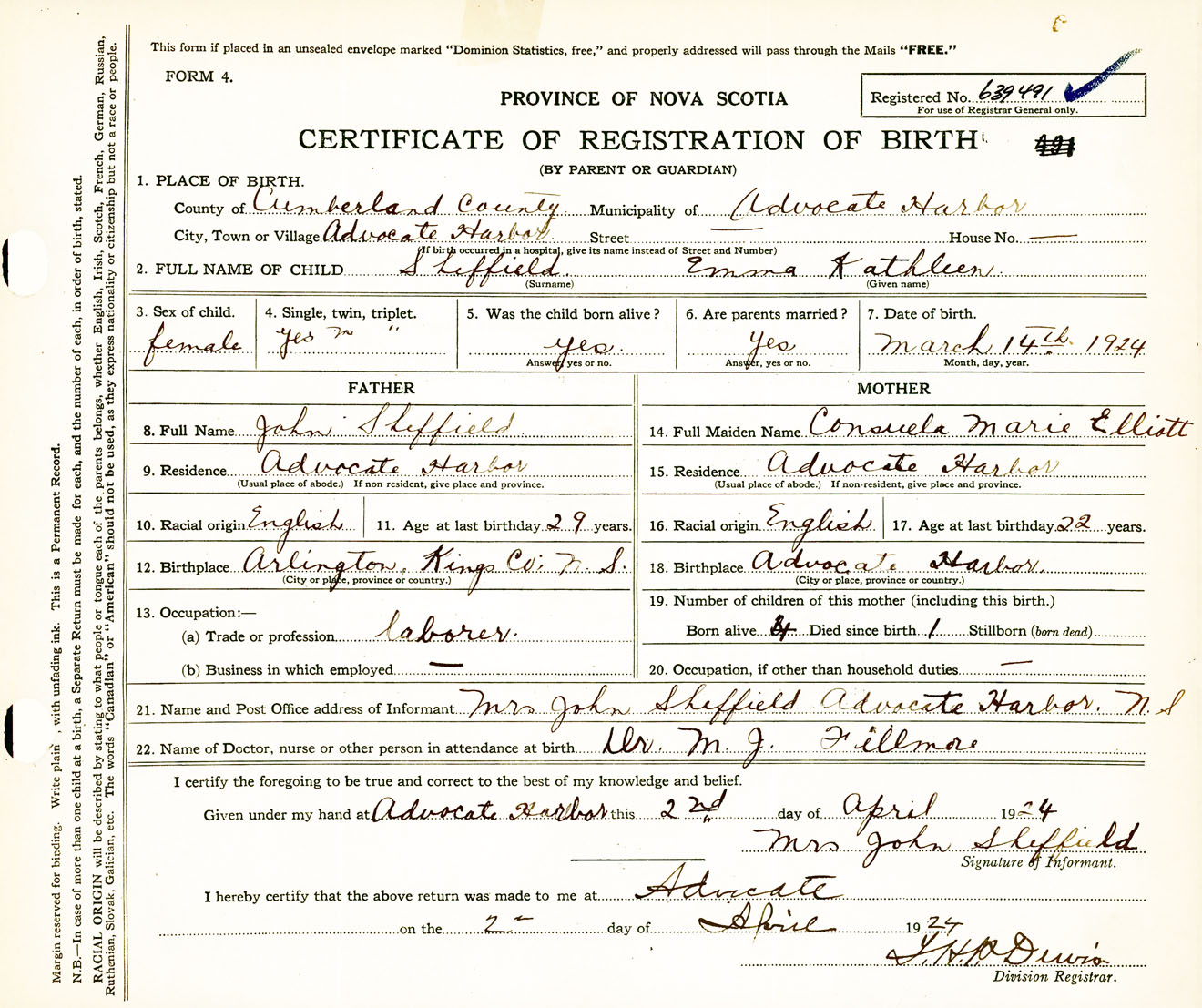 Female Birth Registration: Year: 1924 number: 63900491